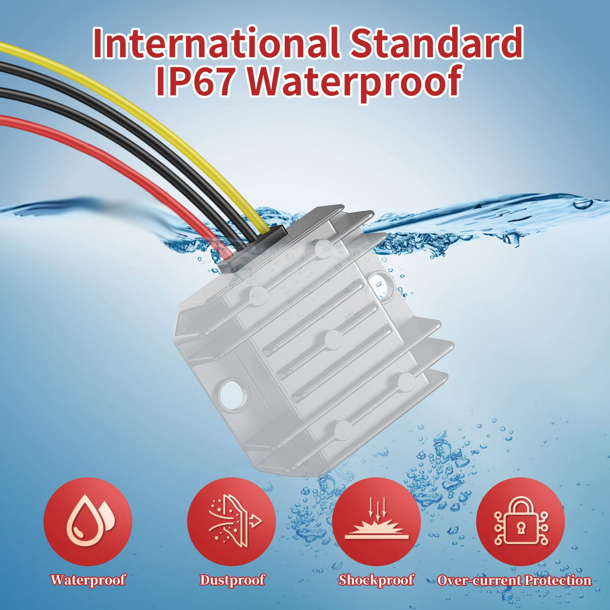 Q: Can I use this buck converter for outdoor applications?A: Yes, the buck converter features an IP67 waterproof rating, which allows it to be used outdoors and withstand heavy rain and harsh weather conditions.