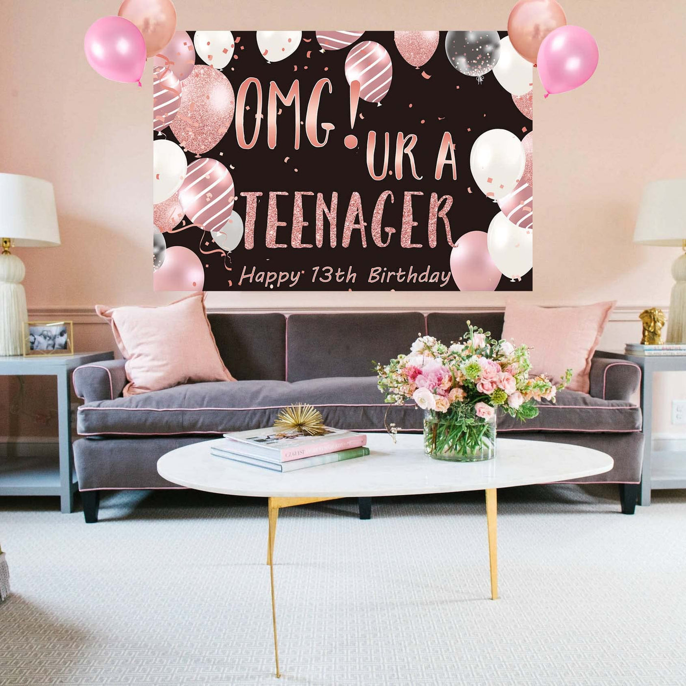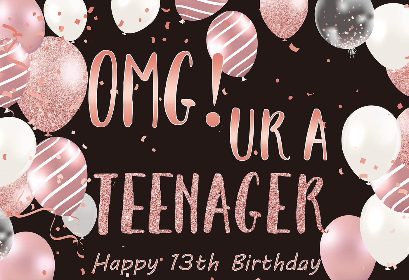 13Th Birthday Backdrop Banner, Omg Ur A Teenager 13Th Birthday Photography Background Black And Rose Gold, 13 Year Old Girls Bir