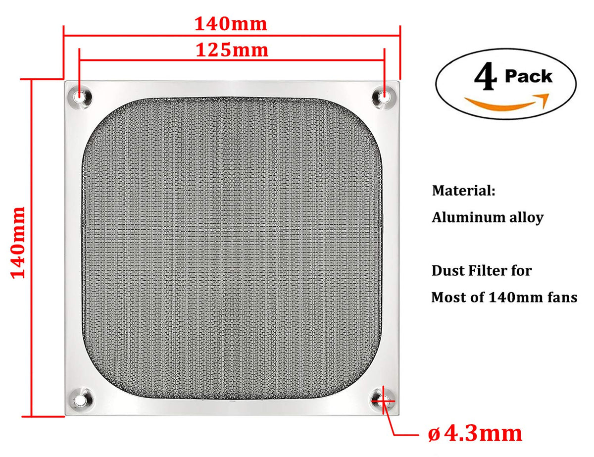 140Mm Computer Fan Vent Filter Grill Compatible With: Standard 140Mm Fan Or Vent Condition: Brand New Color: Silver Material: (1)Frame: Aluminum With 0.6Mm Thickness (2)Mesh: 24#/25.4Mm Stainelss Steel Mount Hole Distance: 125 X 125Mm Screws Are Computer Fan Special Screw(M5*10) Item Dimensions: 5.5''X0.14''X5.5''(140 X 3.5 X 140 Mm) Shipping Weight: 5.17Oz / 146G Package Includes: 4X Fan Filter Grill 16X Screws