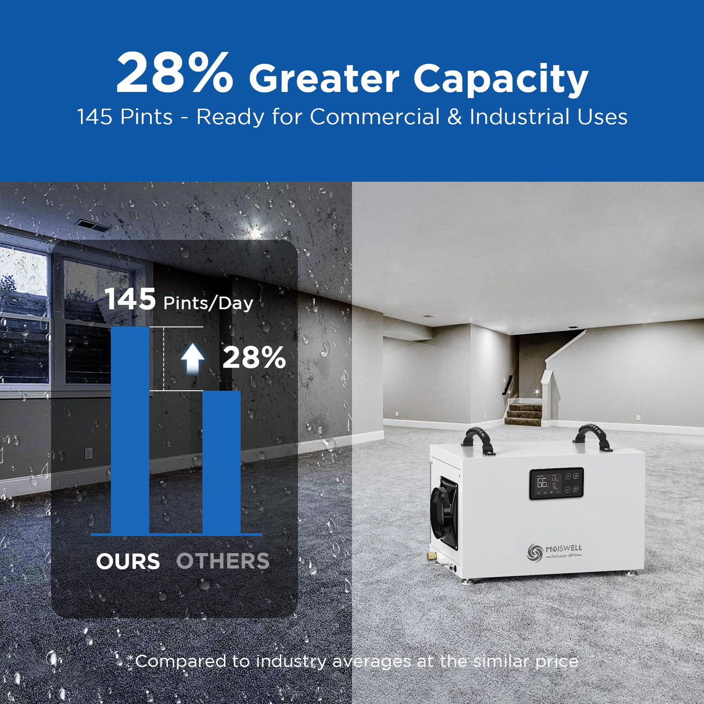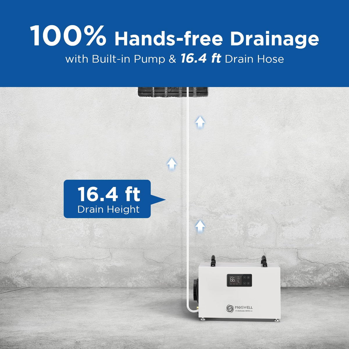 Why You Choose Moiswell Crawlspace Dehumidifier? ?High Efficiency, Covers Large Spaces Over 6,000 Sq Ft It Removes 145 Pints Of Excessive Moisture And 70 Pints At Aham, Ideal To Maintain A Desired Humidity Level In Large Humid Crawl Spaces Or Commercial Places, Like Basements, Garages, Attics, Warehouses, Indoor Pools, Or Grow Rooms. With A High Airflow Of 206 Cfm, The Powerful Restoration Dehumidifier Removes Deeply-Embedded Moisture Retained By House Structures, Being Great For Water Damage Restoration And Construction Drying. ?Trusted Service Moiswell Is A Trusted Brand, Backed With A 5-Year Warranty.&Nbsp;Small Compact Design:Xp70 Crawlspace Dehumidifier Is Much Smaller &Amp; Compact Than Convetional Crawlspace Dehumidifiers On The Market, Specially For Low-Clearance Crawl Space And Tight Basement Or To Fit In Between Floor Joists By:&Nbsp; Install On The Floor&Nbsp; Hang On With A Hang Kit(Buy Separately) This Dehumidifier Is Designed To Drain Collected Condensate By Its Internal Heavy-Duty Pump, Which Can Drain Condensate Upward Or Across By 16.5 Ft With Included 13 Ft Drain Hose. However, You Can Choose Gravity Drain With Included 6.5 Ft Hose. Optional Remote Control(Buy Separately): The Easy-Carry Dehumidifier Can Be Controlled By A Remote Dehumidistat Controller, Which Is Sold Separately. The Controller Allows You To Monitor And Control Current Dehumidifying Status, Humidity Level, Room Temperature, Timer, And Defrost Status. Dehumidifier Ducted (Buy Separately): The Air Outlet Is Duct-Able, Allowing To Duct If Necessary.