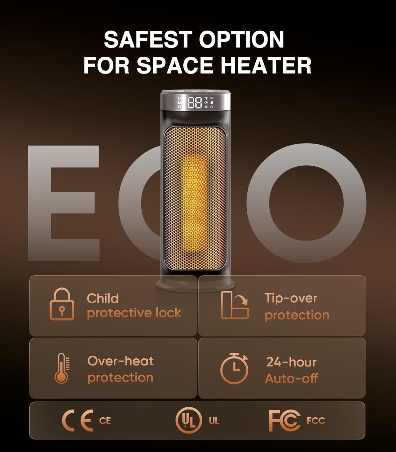 Q: What energy-saving features does this space heater have?A: This space heater includes an ECO mode that lets you set a constant temperature between 41°F and 95°F. It efficiently adjusts its heating power based on the room's temperature, stopping when the desired temperature is reached to save energy and reduce heating costs.