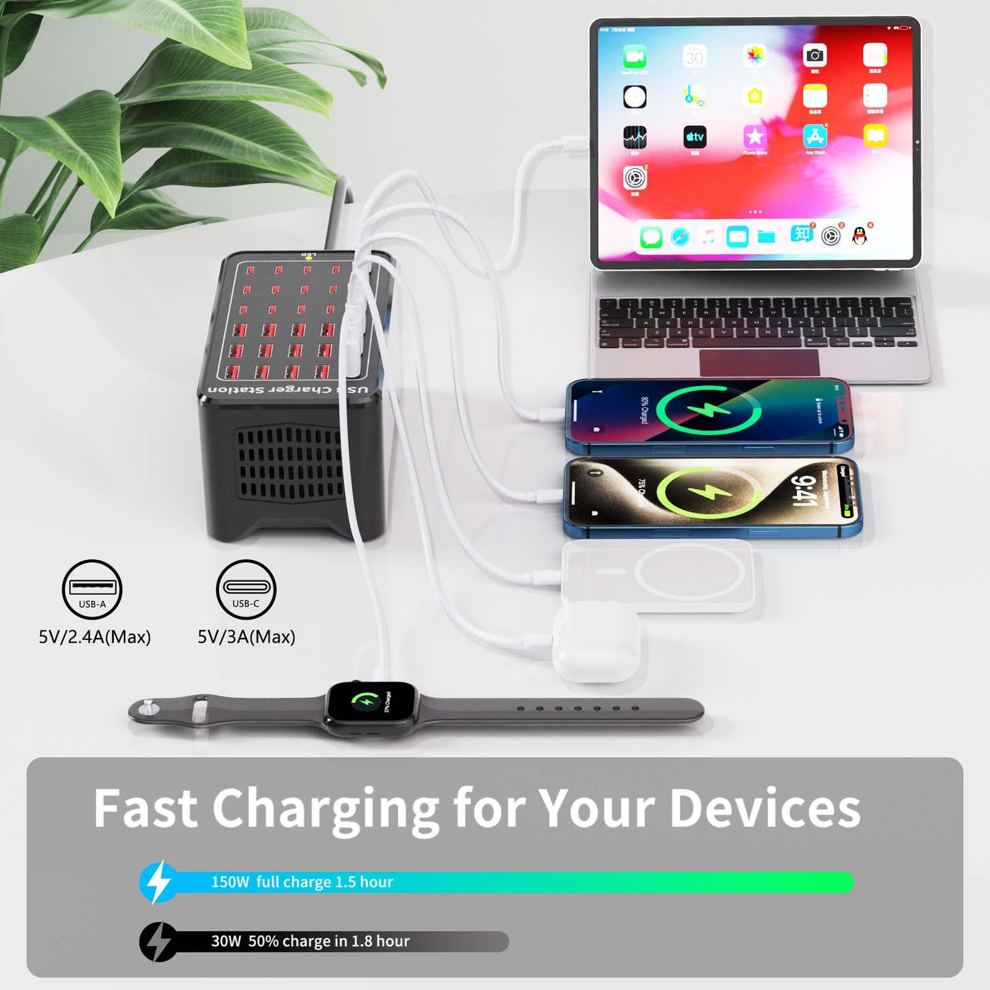 150W(30A) Usb Charging Station, 30-Port Usb C Charger Block, Multiple Desktop/Wall Fast Charger With Intelligent Protection Comp