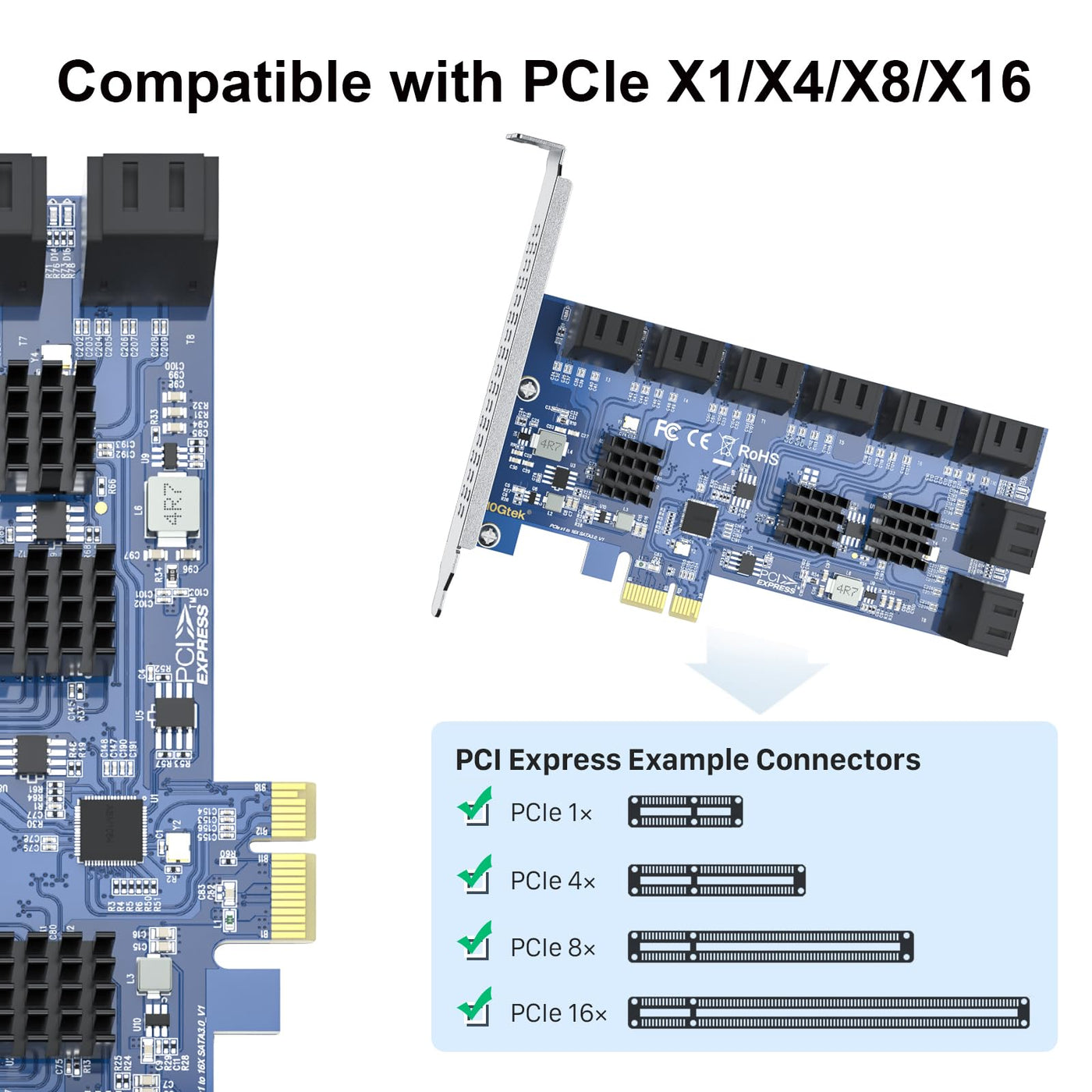 Q: Is this SATA card compatible with all motherboards?A: The 16 Port PCIe SATA Card is compliant with PCIe 1.0, 2.0, and 3.0 protocols and fits into any motherboard PCIe X1, X2, X4, X8, or X16 slot, ensuring broad compatibility.