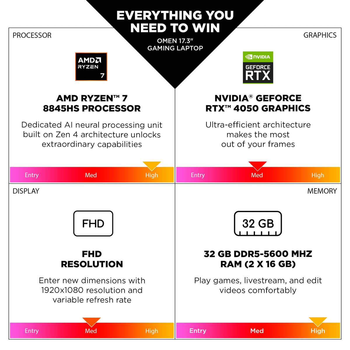 Omen By Hp R7-8840H Yes Ai Dsc Rtx 4050 6Gb 32Gb Ddr5 17.3'' Fhd Ips 300 Nit (144 Hz) Non-Touch 1Tb 802.11Ax 2X2 Bt Hd Wide Fov Webcam No Dual Array Digital Mics 1 Zone Rgb Hyperx Audio Batt 4 Cell C Long Life 70Whr Fstcrg Win11 Home 1 Year Shadow Black