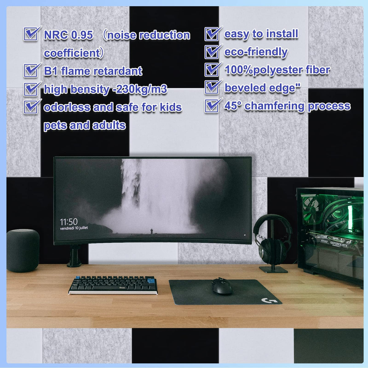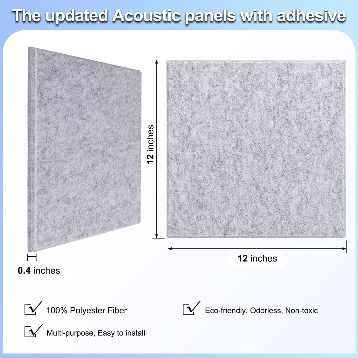 B>Material:B>Br> The Sound Foam Panels Is Made Of Polyester Fiber Material, Which Has High Ductility And Wear Resistance It Is Not Easy To Be Deformed And Damaged, And Has A Long Service Life It Can Adapt To Humid Environments And Reduce Indoor Echo And Noisebr> B>Size:B>Br> Length: 12 Inchesbr> Width: 12 Inchesbr> Height: 04 Inchesbr> Weight: 03 Poundsbr> B>Design:B>Br> The Sound Pads Adopts 45Achamfering Process, 127Mm Bevel, No Gaps In Installation, It Is Beautiful And Fashionablebr> The Sound Insulation Panels Comes With Self-Adhesive, It Can Be Pasted By Tearing Off The Paper Film On The Back, Reducing Installation Cost And Easier Operationbr> Easy To Clean, Vacuum Cleaner, Damp Cloth Can Be Cleanedbr> B>Wide Range Of Applicationsb>Br> Sound Cancelling Foam Can Be Used In Professional Recording Studios, Rehearsal Rooms, Concert Halls, Podcasts, Churches, Home Theaters, Vocal Rooms, Home Studios, Offices, Manholes, Recording Studio Environment Equipment Etcbr> B>Quality Service:B>Br> If You Have Any Questions During The Purchase Of These Room Soundproofing, Please Feel Free To Contact Us We Have Professional Customer Service To Answer Your Questions Until The Problem Is Solved