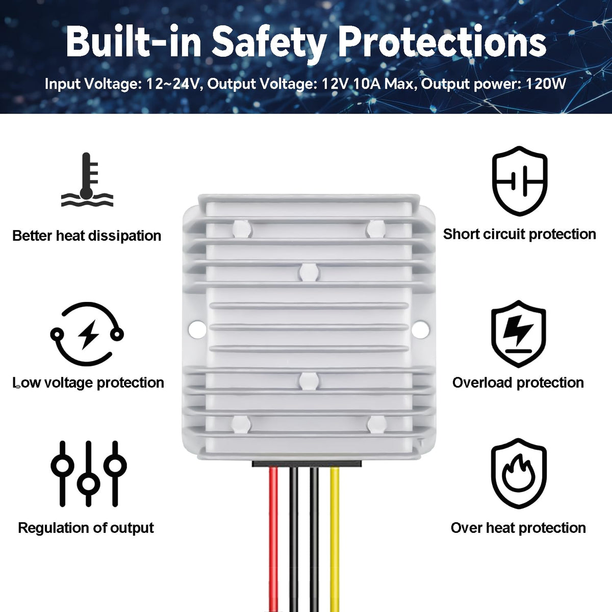 Q: Does the converter have safety features for protection?A: Yes, the converter is equipped with a built-in smart chip that provides multiple layers of protection against over-current, over-voltage, under-voltage, overload, low-load, short circuit, and overheat.