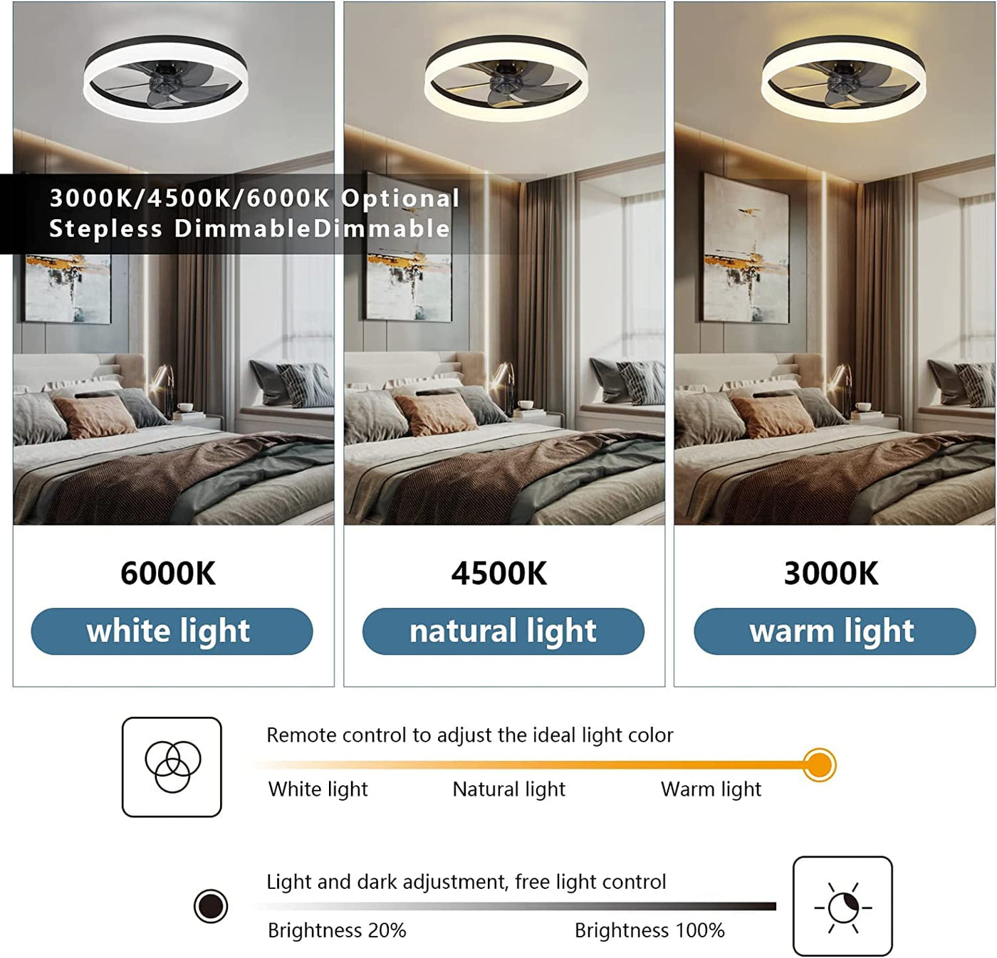 Q: What are the adjustable features of the fan's light?A: The fan's light is dimmable with brightness settings ranging from 20% to 100%. It also offers 3 different color temperatures (3000K, 4500K, and 6000K), allowing you to customize the ambiance of your space according to your preference.