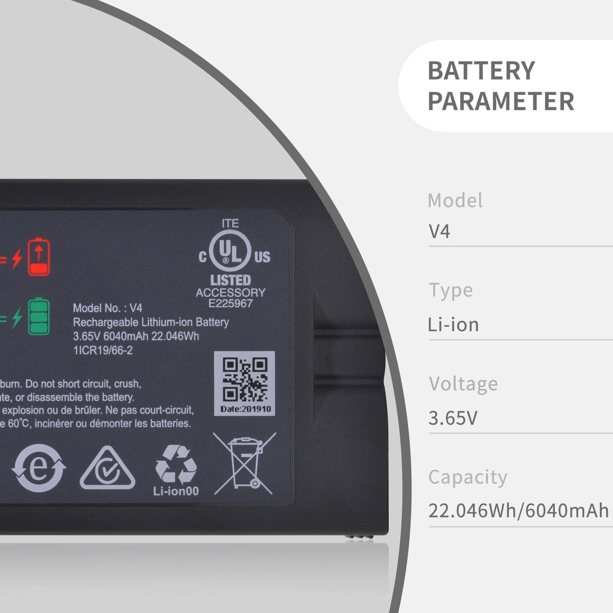 Welcome To Our Store Specification: Voltage: 3.65V Capacity:6040Mah/22.046Wh Battery Condition: Brand New Battery Type: Lithium Ion Worry-Free Warranty:An 12-Month Warranty And Friendly Customer Service Within 24 Hours, Easy-To-Reach Support. Compatible Part Numbers: Model Number: V4 1Icr19/66-2 Compatible Machine Models: For Ring- Video Doorbell 1/2/3/3 Plus, For Spotlight Cam Battery, For Spotlight Cam Solar, For Stick Up Cam Battery (All Generations), For Stick Up Cam Solar (All Generations), For Solar Floodlight Or Peephole Cam Package Included :1 Pack*Replacement Battery+1*Charging Dock+1*Charing Cable