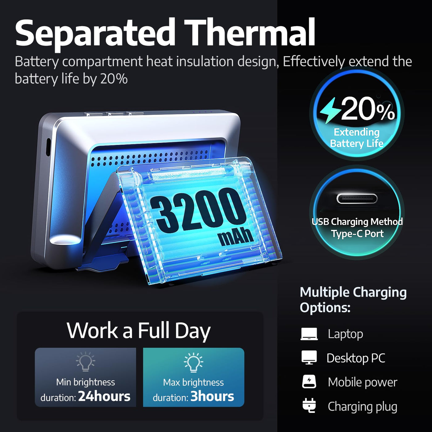 Q: How long does the battery last on a single charge?A: The high-capacity 3200mAh battery provides up to 24 hours of use at the lowest brightness setting and approximately 3 hours at the highest brightness, making it suitable for extended video calls.