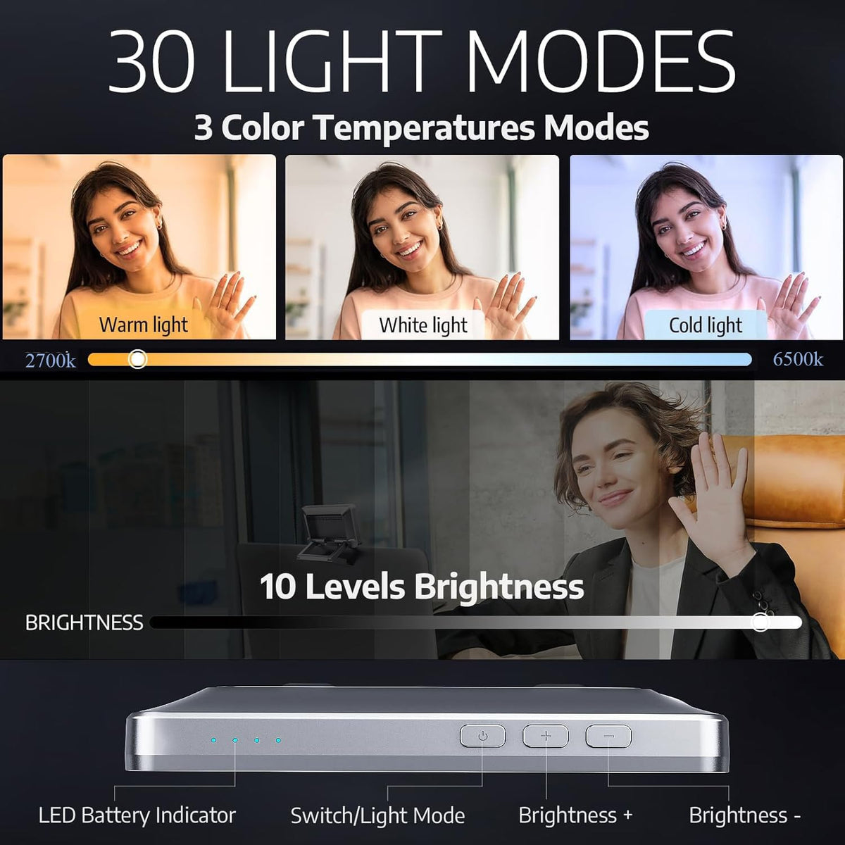 Q: What are the lighting modes available for the LitONES Zoom Lighting?A: The LitONES Zoom Lighting features 30 lighting modes, which include 3 color modes and 10 brightness levels, allowing you to adjust the color temperature from 2700K to 6500K for optimal video conferencing lighting.