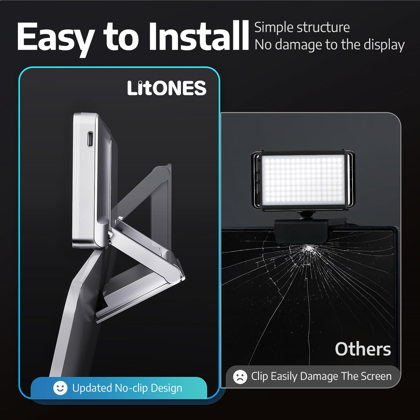 Q: Is the LitONES Zoom Lighting portable for travel?A: Yes, the LitONES Zoom Lighting is designed to be compact and portable, making it ideal for travel. Its one-piece folding clip design allows for easy installation on laptops or desktops without causing damage.