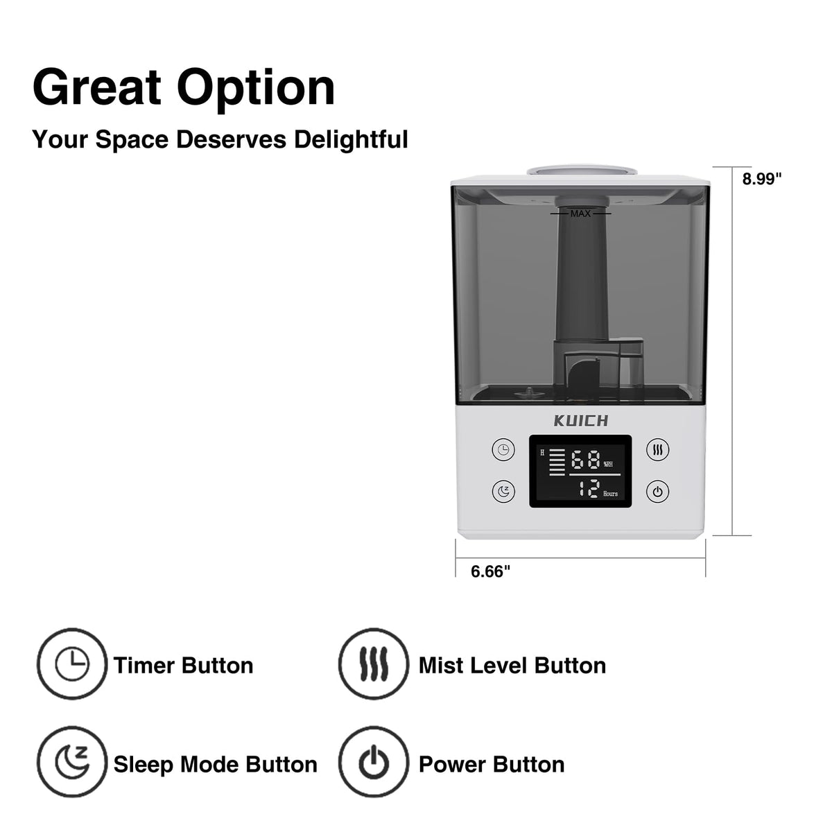Q: What are the benefits of using the KUICH 2.4L Air Humidifier?A: The KUICH 2.4L Air Humidifier helps maintain optimal humidity levels in your home, reducing issues like nasal congestion, dry mouth, and sleep disturbances. Its quiet operation at less than 26dB makes it ideal for bedrooms and nurseries, ensuring a peaceful environment.