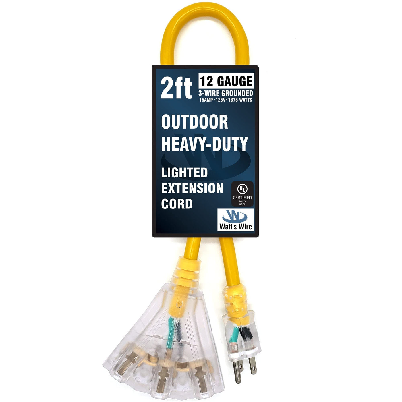 2 Ft 12 Gauge Heavy Duty 3 Outlet Lighted Sjtw Indoor/Outdoor Yellow Extension Cord By Watt'S Wire Short 2' 12 Gauge Grounde