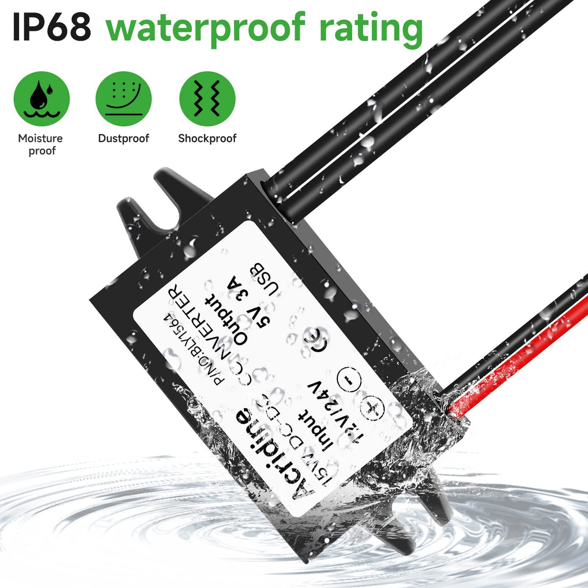 Main Specifications.Suggestion:Dc 12V/24Vinput Voltage Range: Dc 10~32V&Nbsp;Output Voltage: Dc 5V&Nbsp;Output Current: 3Aoutput Power: 15W&Nbsp;Conversion Efficiency: 96%Operating Temperature: -40?~+80?Waterproof Rating: Ip68Dimension: 63*27*14Mmset Includes.2Pcs Dc-Dc 12V/24V To 5V Usb Converter