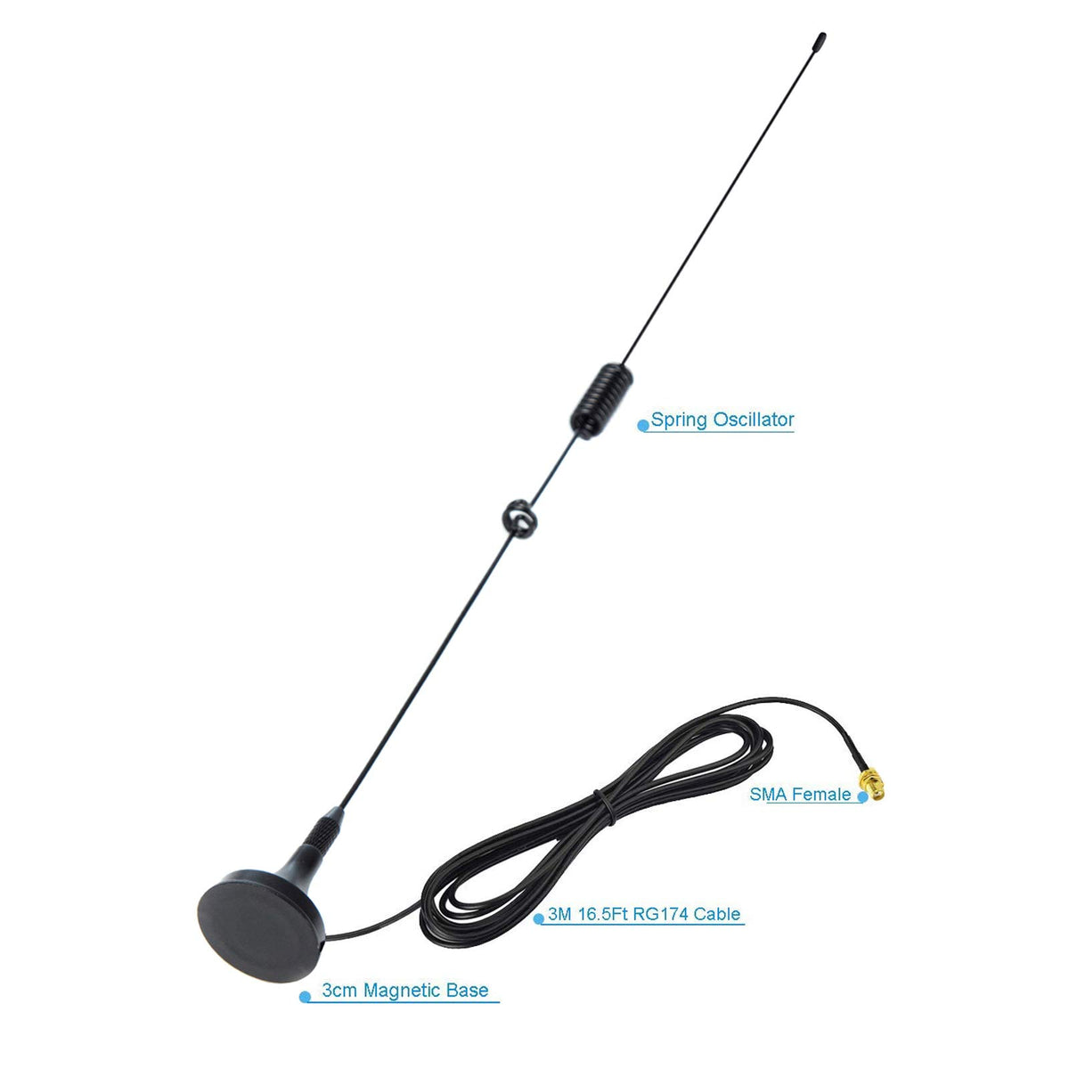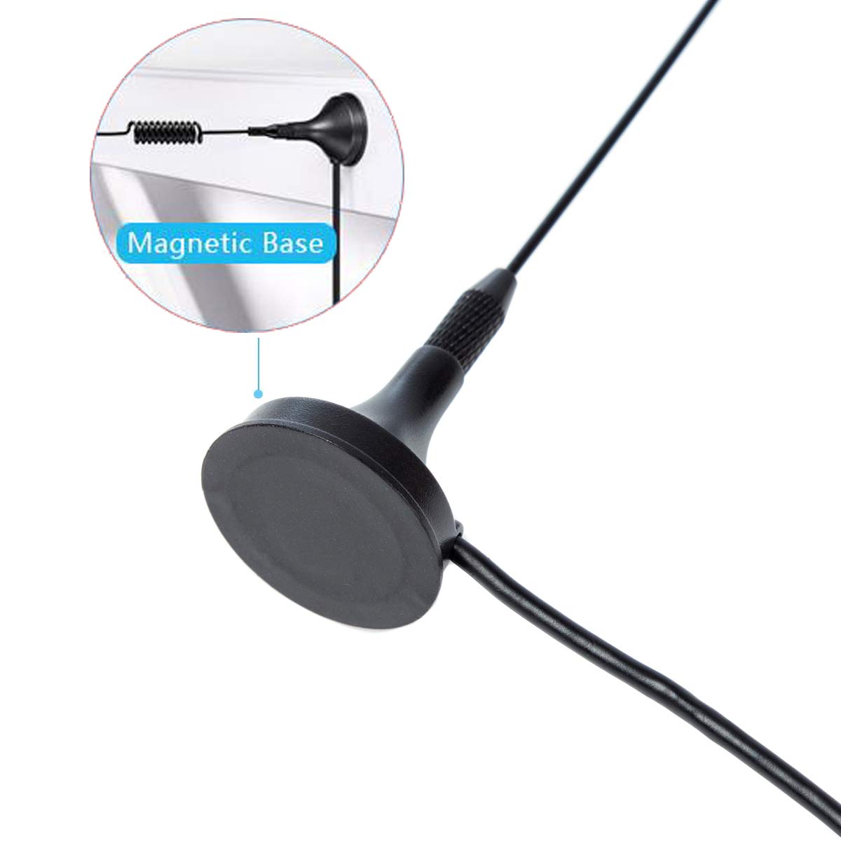 Q: How does the magnetic base work for mounting?A: The antenna comes with a magnetic base that allows for easy and stable mounting on metal surfaces, providing a secure hold while in use, making it ideal for mobile applications.