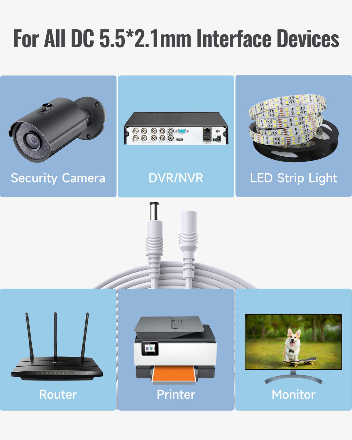 Q: What devices are compatible with the 20ft 6M Power Extension Cable?A: The 20ft 6M Power Extension Cable is compatible with any device that requires a DC 12V input and accepts a 2.1mm x 5.5mm plug. This includes security cameras, routers, printers, and audio pickup devices.
