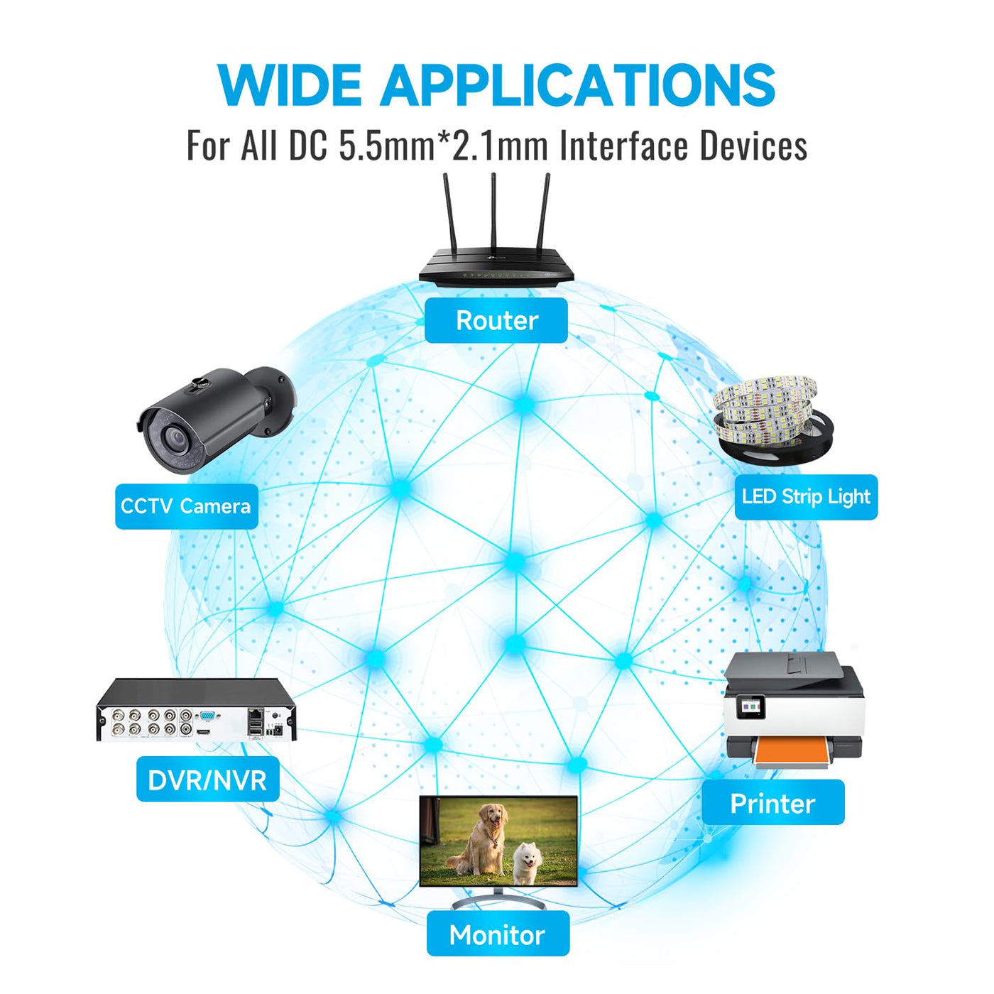 Q: What devices are compatible with the 2 Pack 33ft DC Power Extension Cable?A: The 2 Pack 33ft DC Power Extension Cable is compatible with various devices that require a 12V DC power supply, including CCTV security cameras, IP cameras, LED light strips, monitors, printers, and routers, as long as they have a 5.5mm x 2.1mm plug.