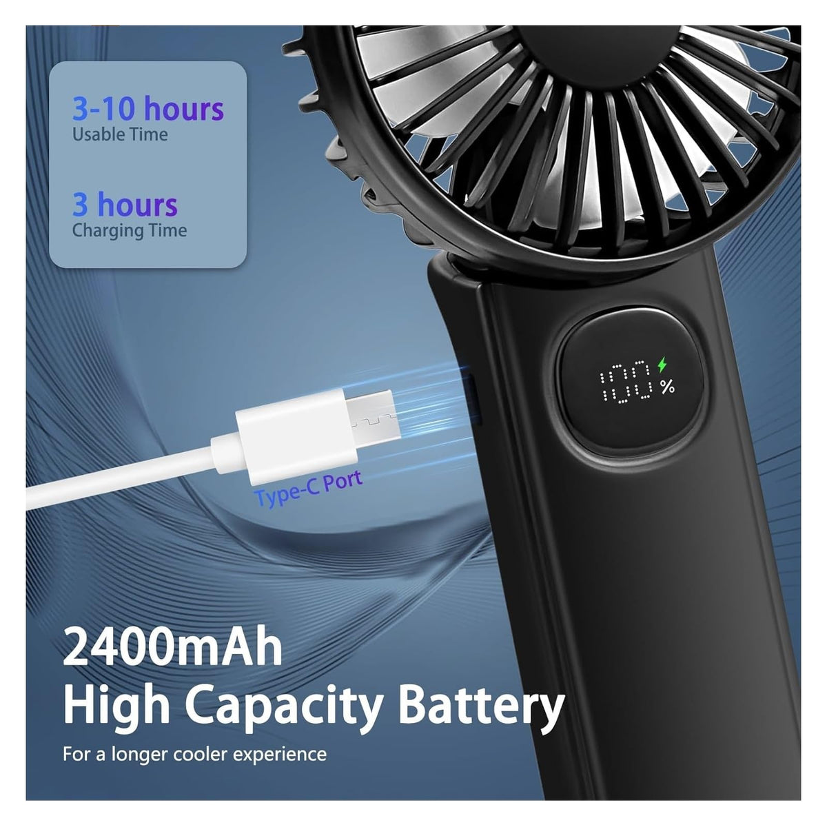 Q: How long does the battery last on a full charge?A: The mini fan is equipped with a rechargeable 2400 mAh battery that provides up to 10 hours of cooling time on a full charge, making it ideal for extended use during travel or outdoor activities.