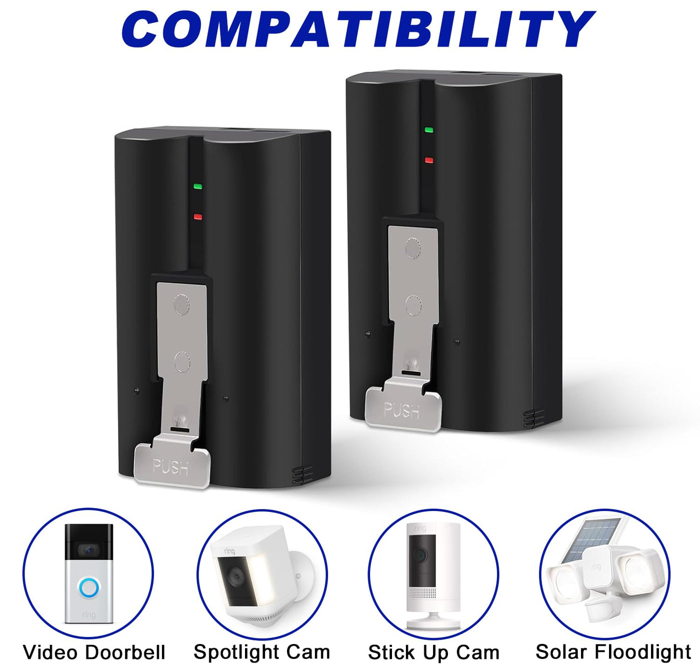 Q: What devices are compatible with the 2-Pack 6040mAh Replacement Battery?A: The 2-Pack 6040mAh Replacement Battery is fully compatible with various Ring devices, including the Ring Video Doorbell 2, 3, 3 Plus, 4, the Battery Doorbell Plus, and all generations of Stick Up Cam and Spotlight Cam, both Battery and Solar models.