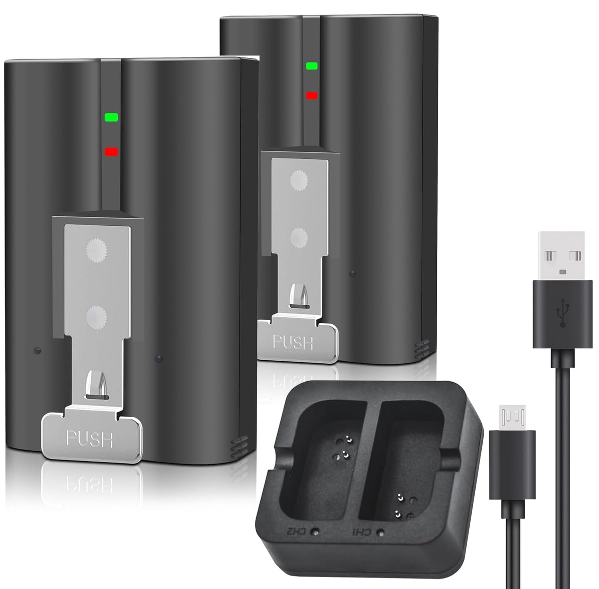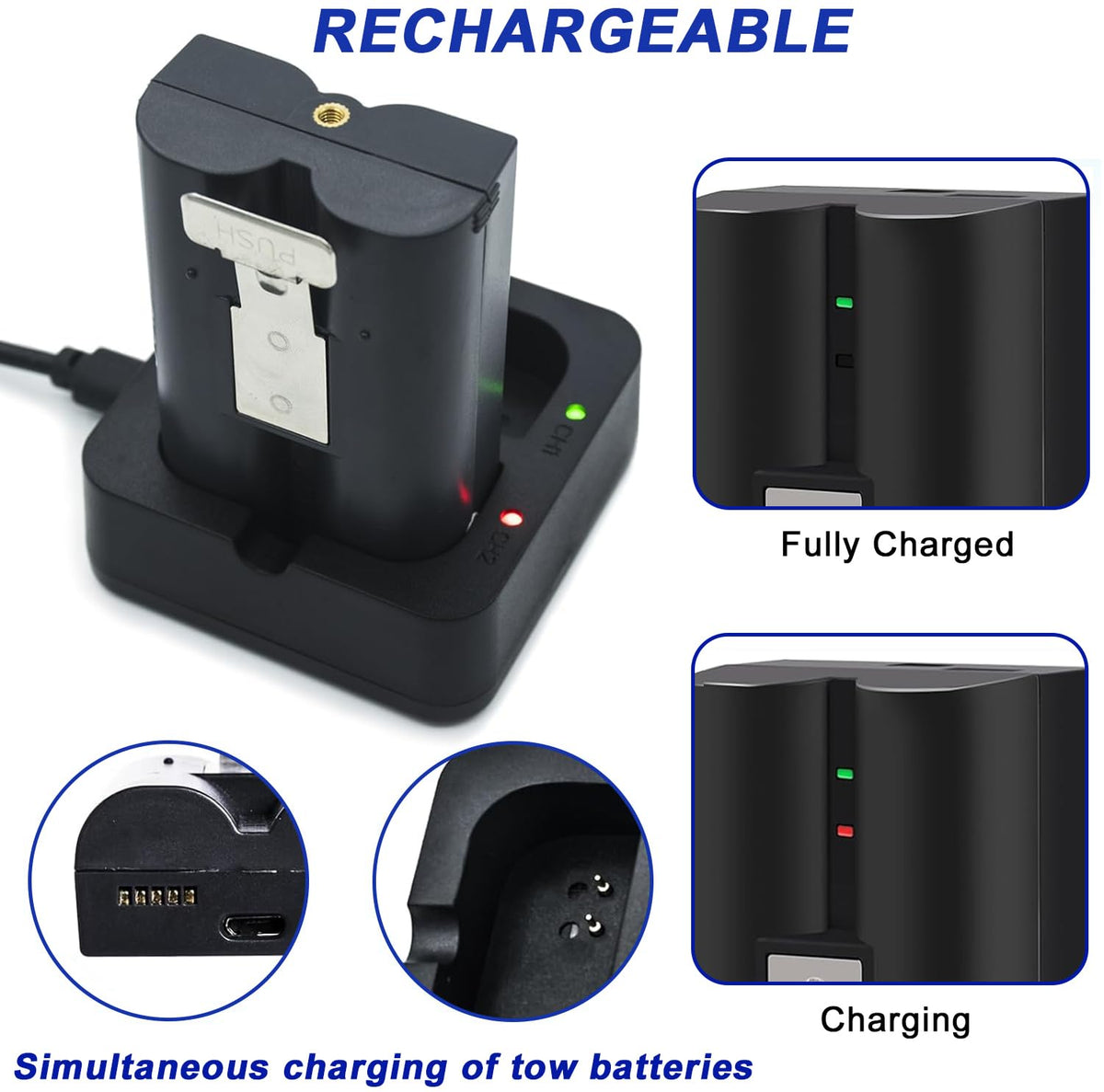 Q: How can I tell when the battery is fully charged?A: The charging station features LED indicators that change color to indicate the charging status. When both the red and green lights are on, the battery is charging. Once both lights turn green, the battery is fully charged.