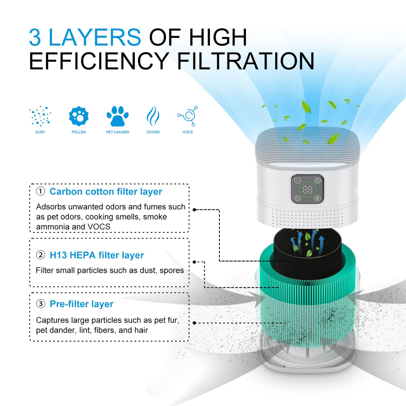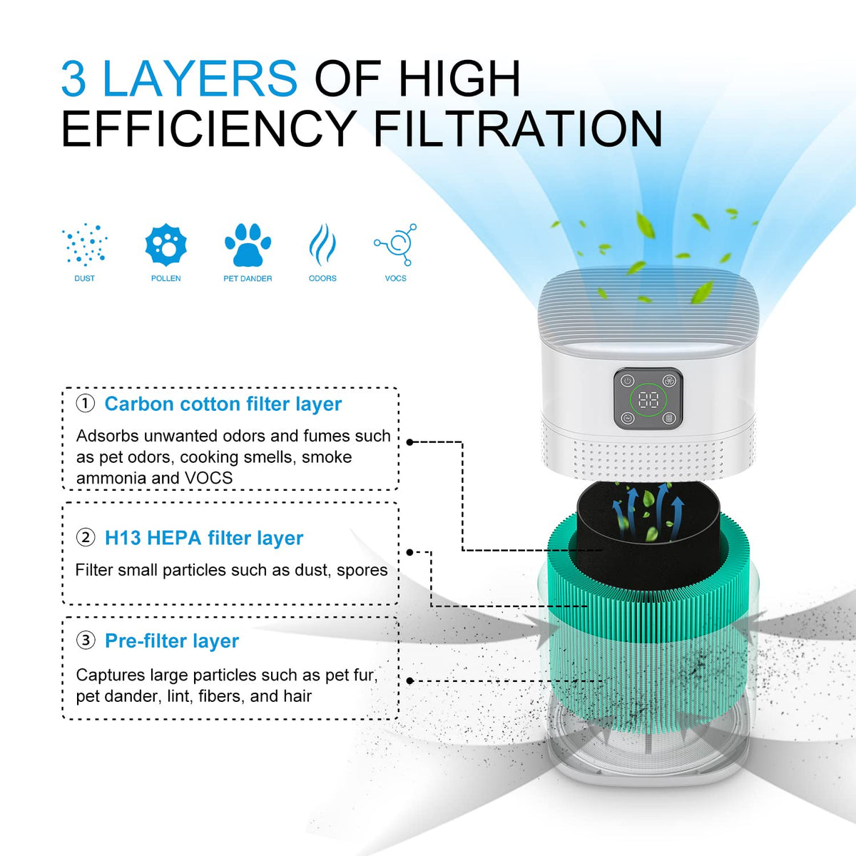 Q: How does the 3-stage filtration system work in these air purifiers?A: The 3-stage filtration system of the Honeyuan air purifiers includes a pre-filter, a true HEPA filter, and an activated carbon filter, which work together to remove up to 99.97% of airborne particles as small as 0.3 microns, ensuring cleaner air.