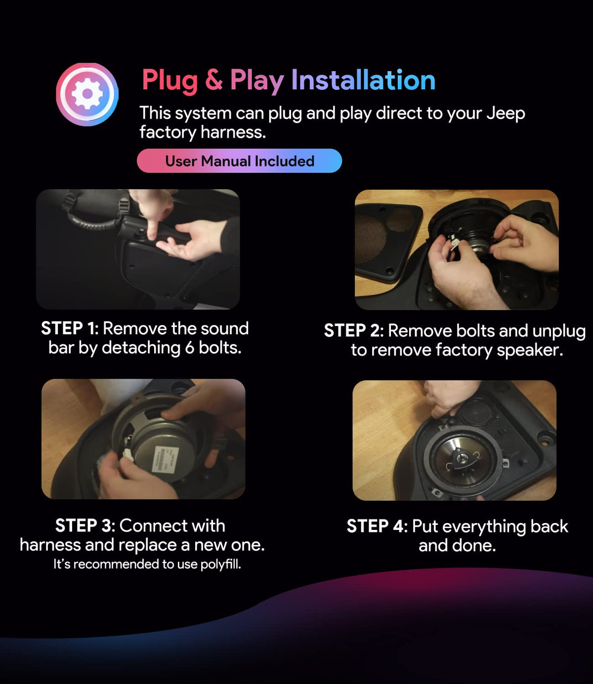 Technique Details 1. Size: 6.5'' 2-Way Speakers 2. Maximum Rms Power Capacity: 75 Watts 3. Peak Power Handling Capacity: 150 Watts. 4. 2 Throw Poly Cone Two-Way Speakers With 1 Inch Titanium Dome Tweeters. 5. Frequency Response 35 Hz To 21 Kh. 6. Crossover For Tweeter 4500 Hz @ 12 Db Per Octave With Dc Protection. 7. Sensitivity 88 Db. Quantity: Sold In 2 Pack Fitment: 2005-2010 Jeep Grand Cherokee - Rear Door 2005-2010 Jeep Commander - Rear Door 2004-2007 Dodge Durango - Front And Rear Door 2005-2011 Dodge Dakota - Front And Rear Door ( Club Cab And Quad Cab ) 2005-2011 Jeep Liberty - Front Door (Base Audio Only) And Rear Door 2006-2010 Chrysler Pt Cruiser - Rear Door 2007-2012 Dodge Nitro - Front Door (Base Audio Only) And Rear Door 2007-2018 Jeep Wrangler Jk Jku 2 Door / 4 Door - Drivers Side And Passengers Side Dash / Sound Bar / Front And Rear Door 2008-2015 Dodge Challenger - Rear Door Special Features 1. Upgrade Your Vehicle'S Sound System: Designed Specifically For Jeep Vehicles, So You Get Automotive Sound The Way It Was Intended. Premium Speaker Upgrade Offers Vibrant Stereo Image, Bigger Bass, And Clean Highs For Your Vehicle From Kicker. 2. Vivid Performance With Affordable Price: Exceptional In Providing Jeep Owners The Best Possible Sound Upgrade You Hope For. The Speakers Are Extraordinarily Vivid In Performance, And At A Very Affordable Price. 3. Heavy Duty Stainless Material: Produce The Highest Quality Of Sound To Fuel Your Driving Experience. The Maximum Rms Power Capacity Is 75 Watts And The Peak Power Handling Capacity Is 150 Watts. 4. Wide Applications: Effectively Utilized For Rear Door, Front Door, Driver'S Side Dash Speaker, Passenger'S Side Dash Speaker And Sound Bar.