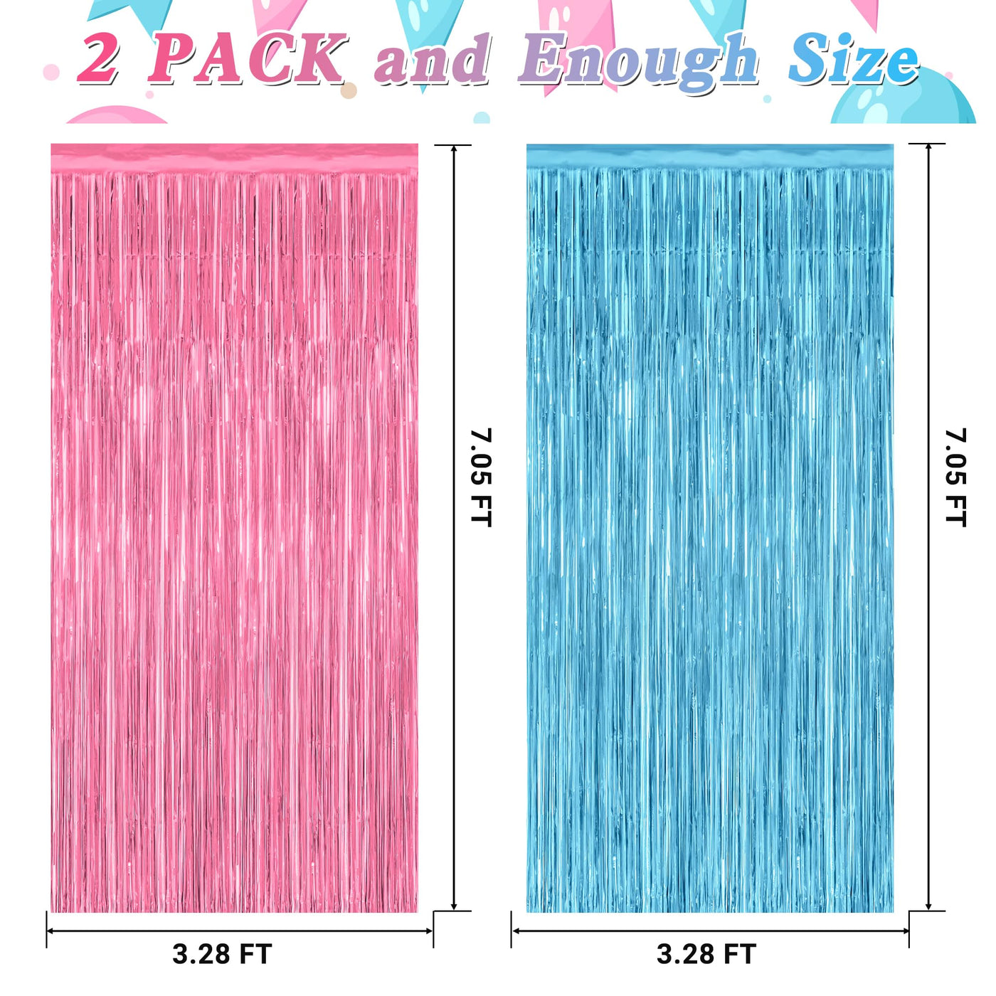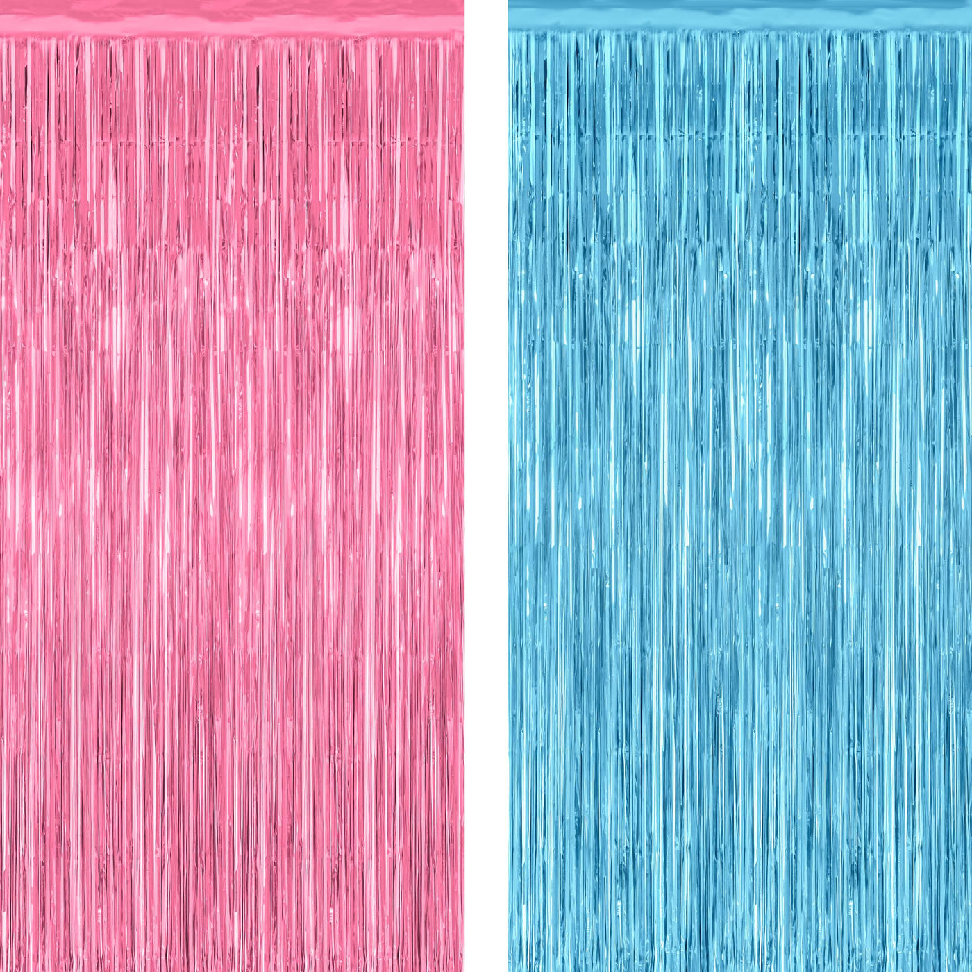 2 Pack Gender Reveal Decorations, 3.28 Ft X 7.05 Ft Pink And Blue Fringe Backdrop, Metallic Boy Or Girl Foil Fringe Curtains Tin