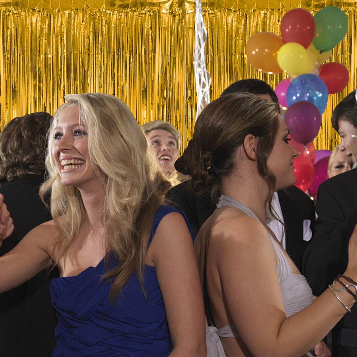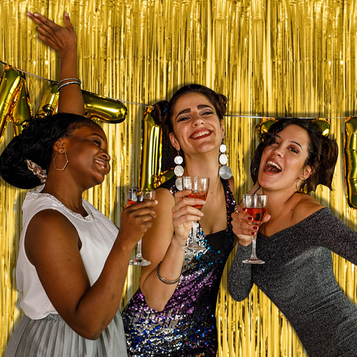 Q: What material is the tinsel backdrop made of?A: The Gold Fringe Curtain Backdrop is made from high-quality shiny tinsel, which features a metallic finish that creates a sparkling and eye-catching effect.