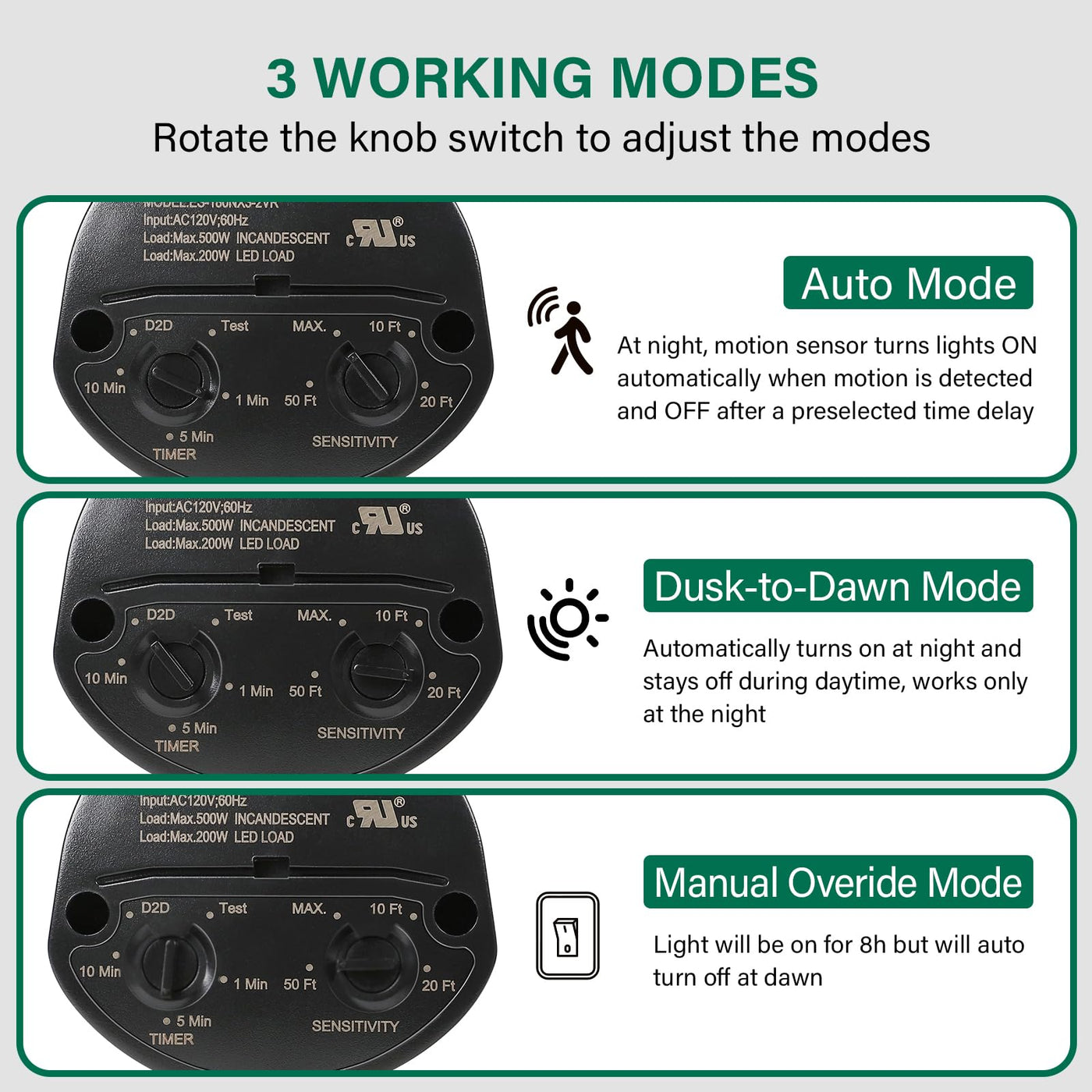 Q: What are the different modes of the 2 Pack Motion Sensor?A: The motion sensor features three modes: 'Auto Mode' which activates the light upon detecting movement in darkness, 'D2D Mode' that allows the light to stay off during the day and turn on at night, and 'Manual Override Mode' that keeps the light on for 8 hours but automatically turns off at dawn.