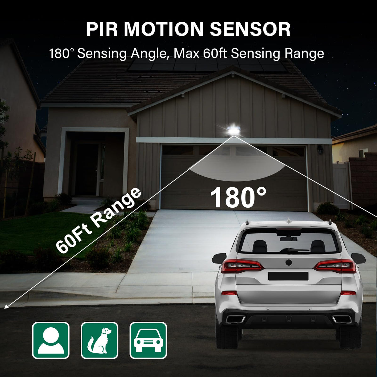 Q: How far can the motion sensor detect movement?A: This motion sensor has an impressive detection range of up to 60 feet with a 180-degree coverage area, making it ideal for monitoring larger outdoor or indoor spaces.