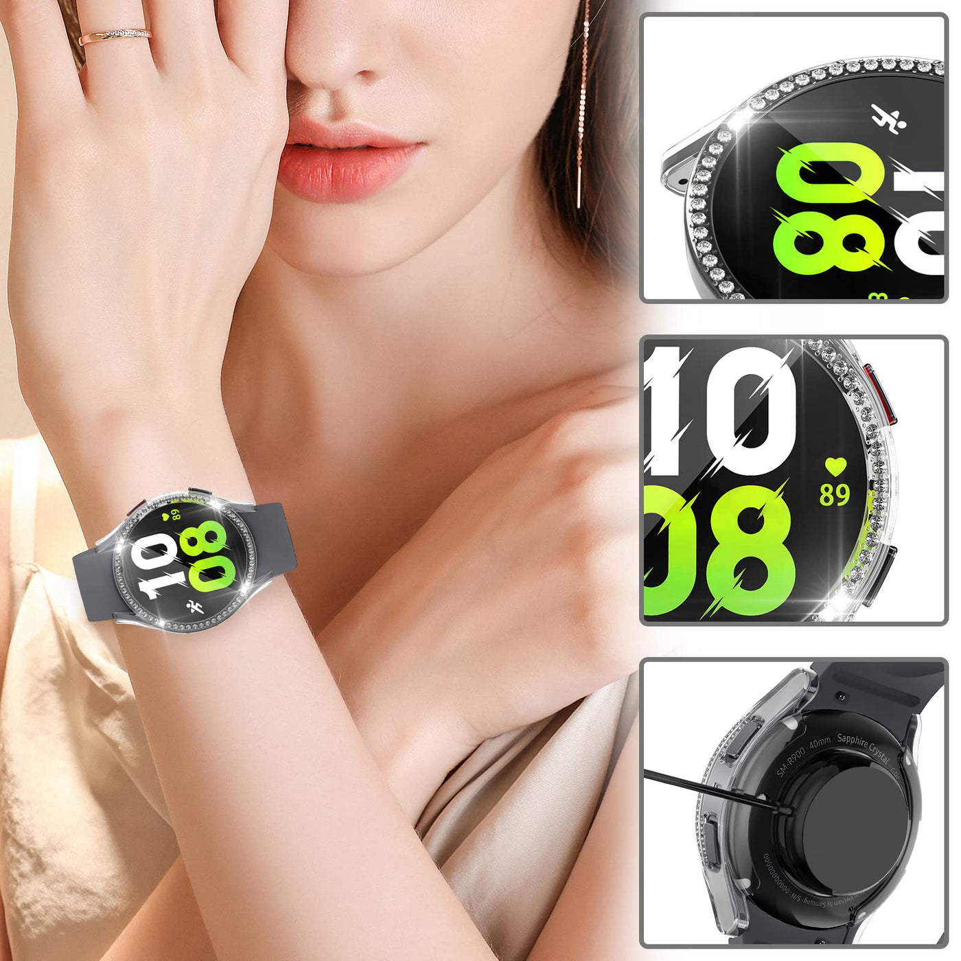 • Q: How does the diamond design enhance the RICHONE Screen Protector Case? A: The RICHONE Screen Protector Case features a creative design with a ring of sparkling diamonds. This not only offers full protection for your Samsung Galaxy Watch but also adds a decorative touch, making your watch look stylish and unique.