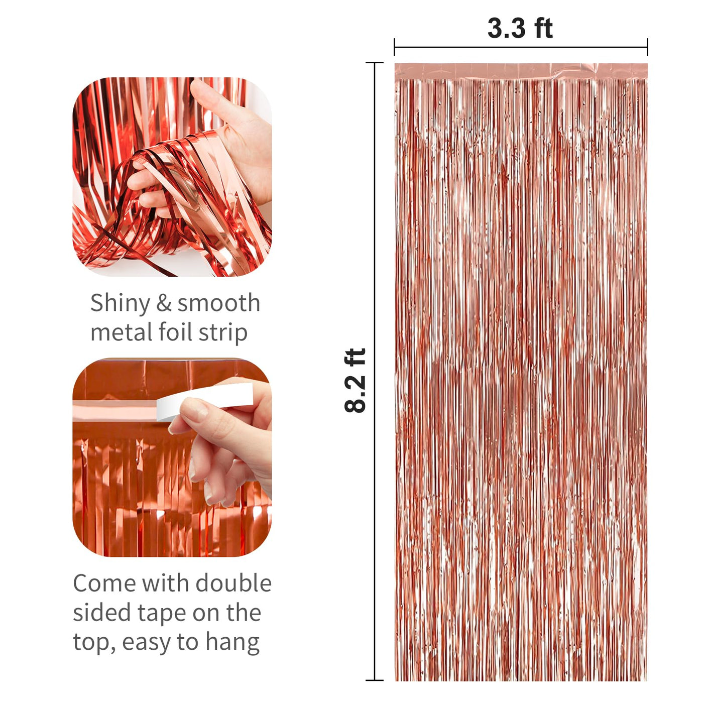 Q: What are the dimensions of each foil fringe curtain?A: Each foil fringe curtain measures 3.3 feet in width and 8.2 feet in height, making them perfect for hanging on doors or covering walls.