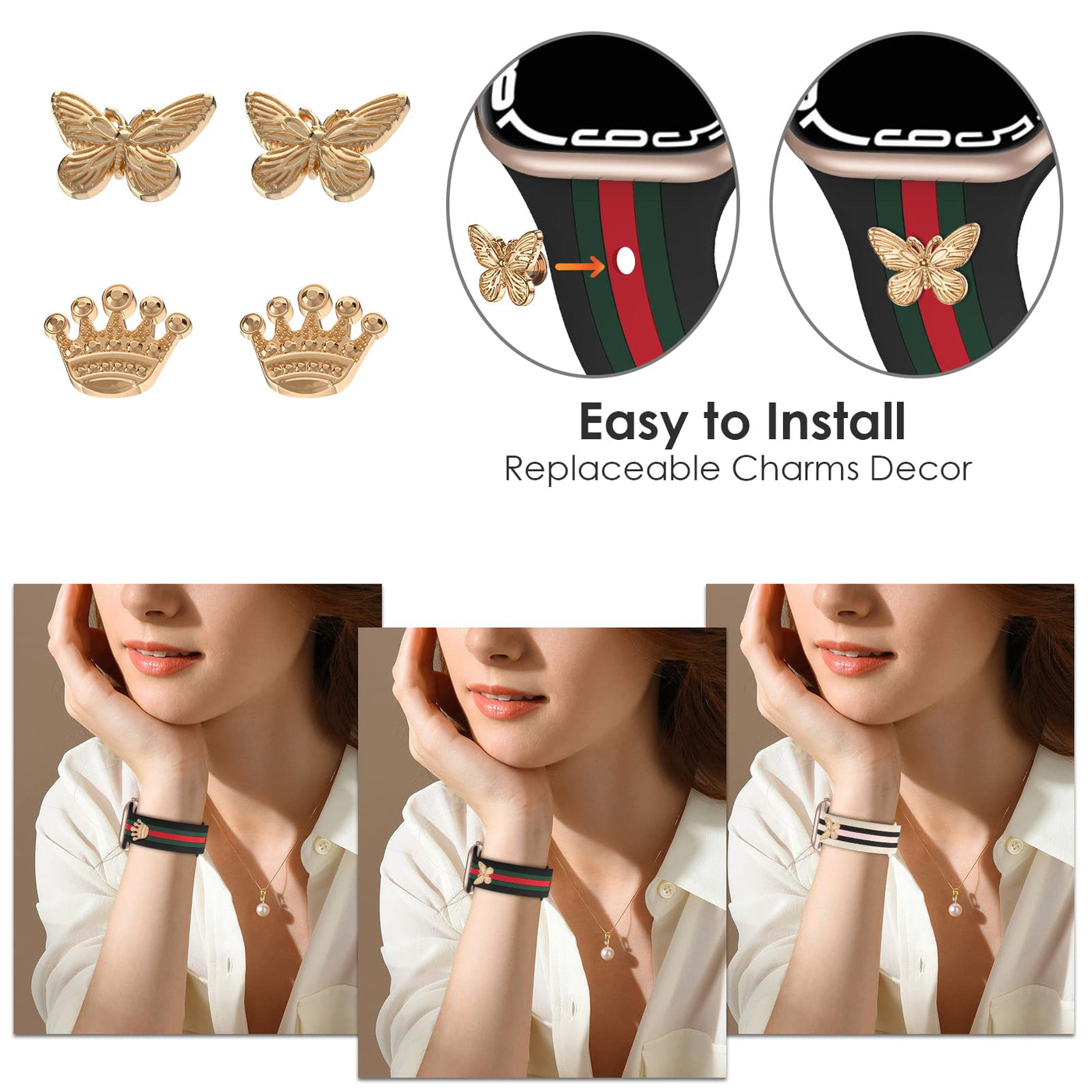 These Decorative Watch Band Charms (No Band) Compatible For Silicone Apple Watch Band, Samsung Watch Band And Fitbit Watch Band. Made Of High-Quality Metal Materials, Very Strong, Smooth Surface, High-Grade Metal Texture. Stylish Personaized Design, Can Mix And Match As You Like, Show Your Personality. Package Included: 2 Pairs Watch Band Charms