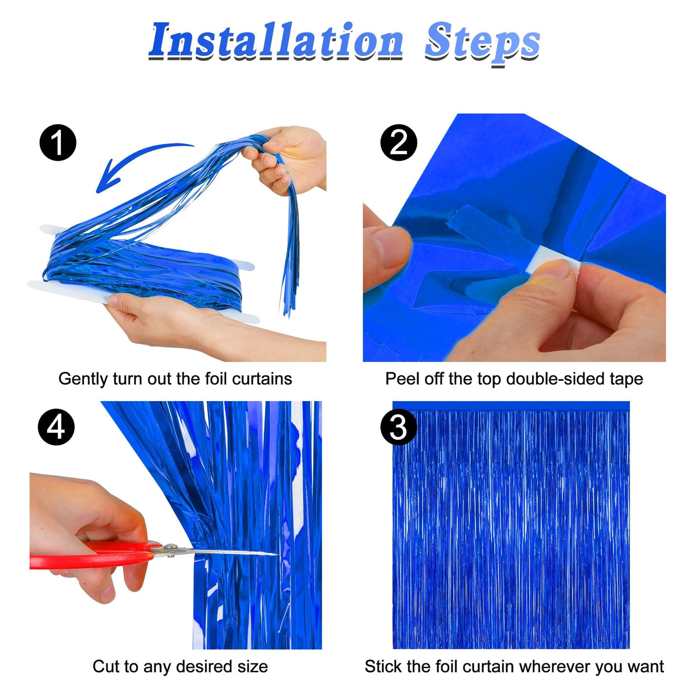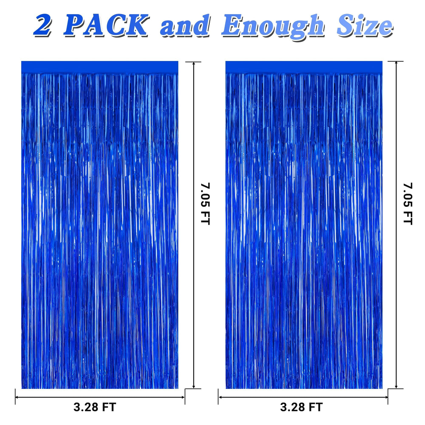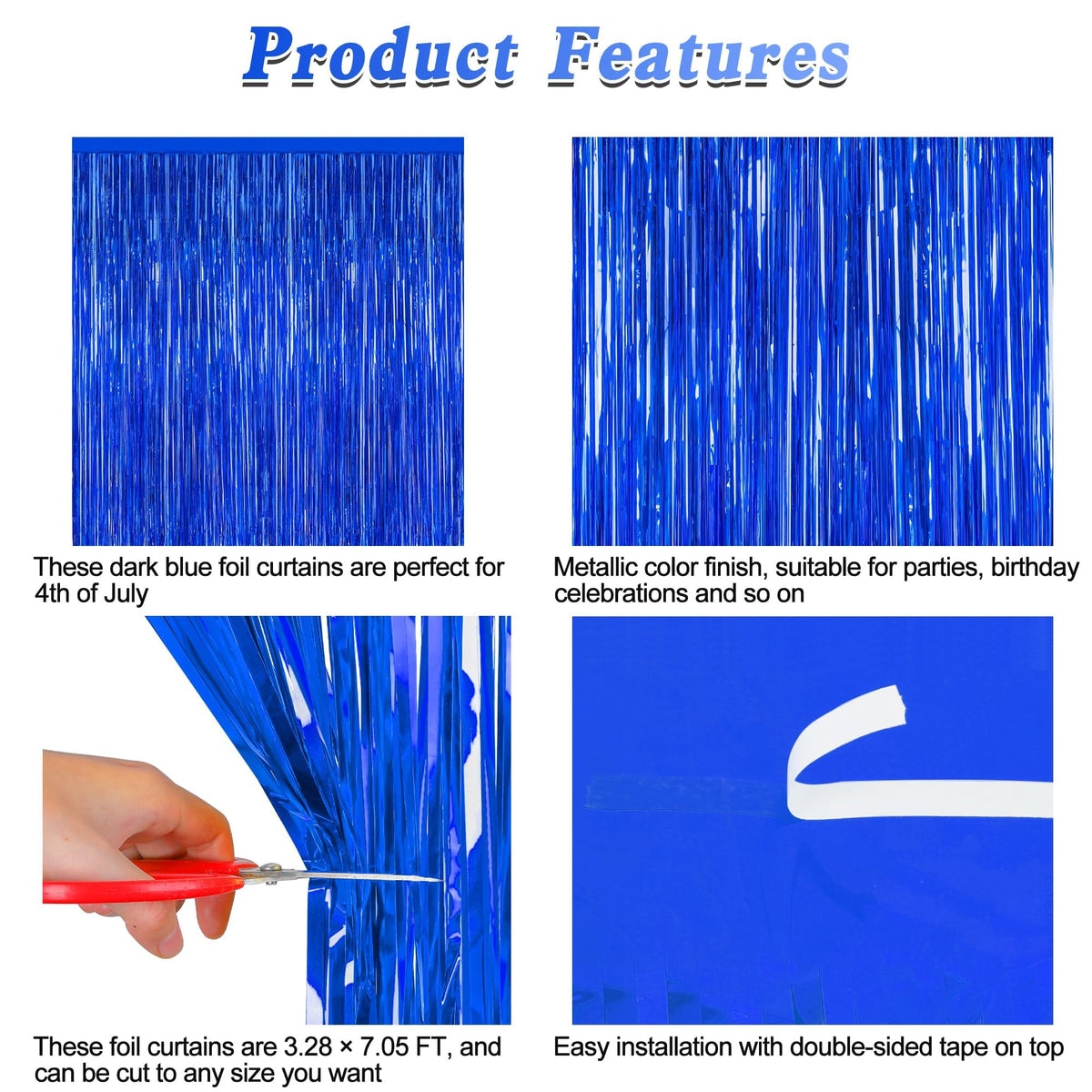 Celebrate Independence Party With These Navy Blue Tinsel Backdrop! Quantity: 2 Pcs Size: 3.28 Ft X 7.05 Ft Colors: Dark Blue Design: Metallic Glossy Design Features: Large Size: Can Be Cut To Length As Needed Non-Tearable: 23 M Pet Material, Lightweight And Non-Tearable Easy To Install: Comes With Adhesive Tape, No Assembly Required Use Occasions: Independence, Party, Birthday Warm Tips: These 4Th Of July Backdrop Come With Adhesive Paper, But Please Do Not Stick Them On Rough And Uneven Surfaces.