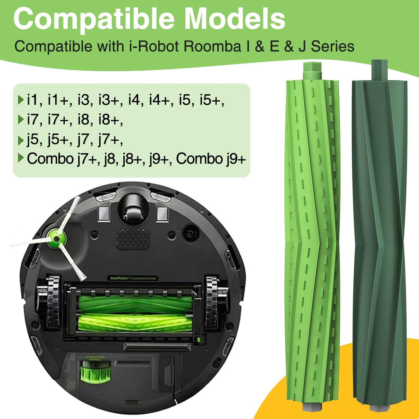 Q: Are these replacement rubber roller brushes compatible with my iRobot Roomba vacuum model?A: Yes, these replacement rubber roller brushes are designed to fit various iRobot Roomba models including e5, e6, e7, i1, i1+, i2, i3, i3+, i4, i4+, i5, i5+, j5, j5+, i6, i6+, j6, j6+, i7, i7+, j7, j7+, i8, i8+, j8, j8+, and j9+.