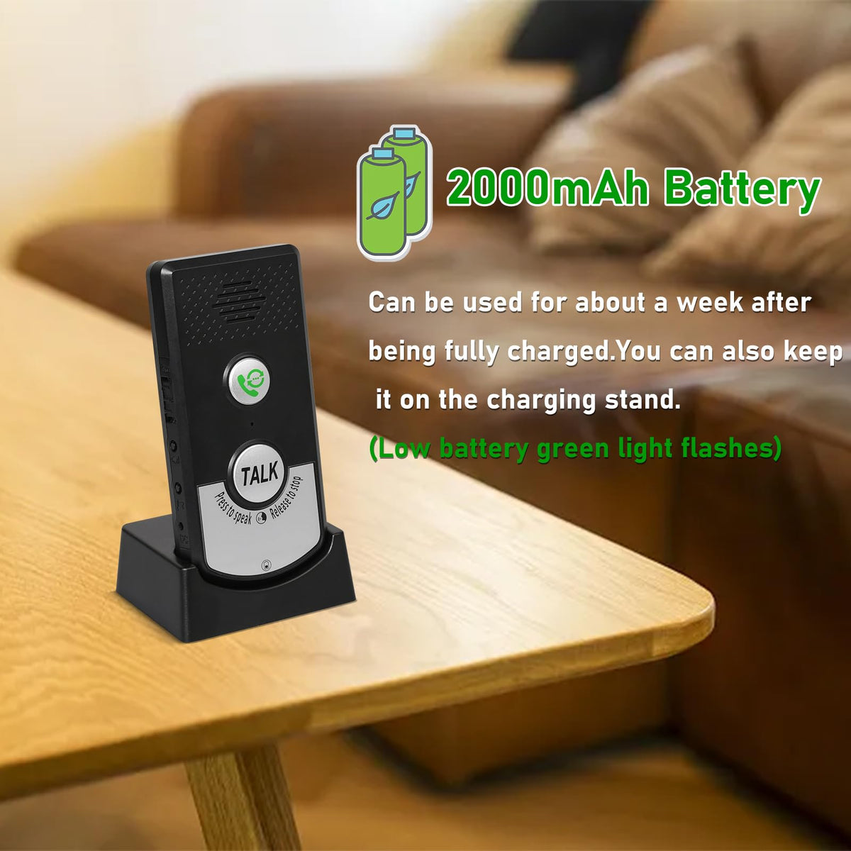 Q: What are the key features of this wireless intercom system?A: Key features include dual channels for two-way communication, long battery life due to an intelligent power-saving chip, and a transmission distance of up to 1,000 meters in open areas.