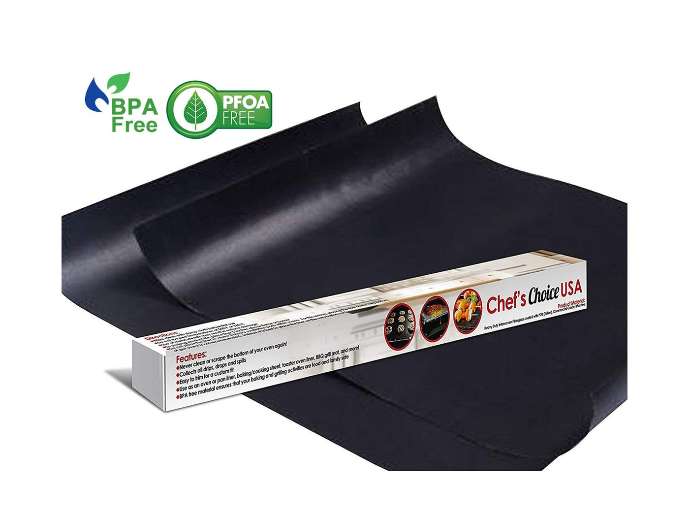 Chefs Choice Oven Liners- The Leader In Home & Kitchen Product Qualityline Your Ovens, Baking Pans Or Trays, And Bbq Grills With Our High Quality Liners And Permanently Say Goodbye To The Mess. With Teflon, You Can Simply Wipe Clean Or Rinse Off, Meaning That Youll Never Have To Scrub Burnt On Foods Again! Cook And Bake With Confidence Knowing That If By Chance You Do Have A Spill, Cleanup Will Be A Breeze. You Will Soon Find That Youll Refuse To Cook Or Bake Without Our Liners As A Valued Part Of Your Kitchen. Use Your Liners As Bbq Grill Mats, Toaster Oven Liners, Pan Liners, Or Even Microwave Liners. With Two Large 17 X 25 Liners Included In Every Order, You Can Be Sure To Make This Purchase Good For Several Uses. For Custom Fits, The Liners Can Easily Be Trimmed With Household Scissors.A Commitment To Quality You Can Trustadmittedly, We Strive To Make Our Products The Best. We Understand That Happy Customers Are Repeat Customers. Thats Why We Design All Of Our Products With Industry Leading Durability And Safety. Our Teflon Liners Are 150% Thicker Than Competing Liners So That You Can Be Sure That Our Product Wont Be The One That Crumbles With Repeated Use. Our Safety Standards Ensure That Our Product Is Bpa Free And Heat Resistant Up To 500 Degrees F, Making It Safe For Your Family. Click The Orange Add To Cart Button Today. Satisfaction Guaranteed!Directions: 1.) For Optimum Safety, Place Liner 5 Inches Above Flame Or Burner. 2.) Do Not Cover Or Block Holes Or Vents Inside The Oven. Avoid Direct Contact With The Heat Element Or Open Flame. 3.) For Optimum Circulation, The Oven Liner Must Not Touch The Walls Or Door Of The Oven. 4.) All Teflon And Non-Stick Products Are Not Recommended To Those Who Have Birds In Their Houses As It May Cause Harm To Birds. 5.) Do Not Place On The Very Bottom Surface Of Gas Operated Ovens.