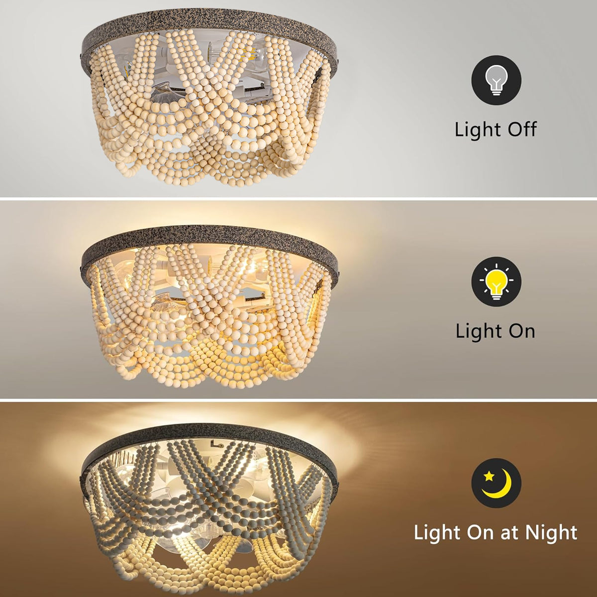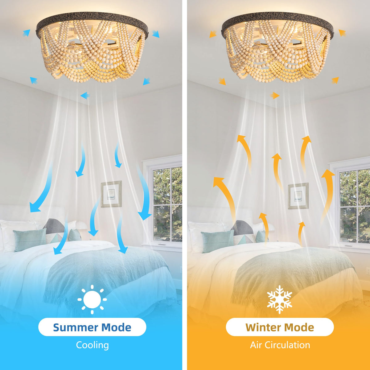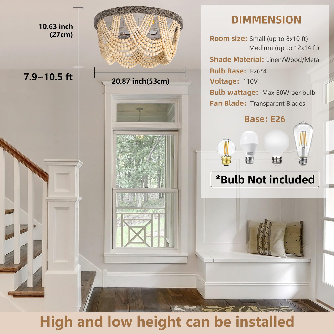20 Boho Ceiling Fan With Light, Bohemian Caged Ceiling Fan With Lights And Remote Control, Wood Beaded Flush Mount With Reversib