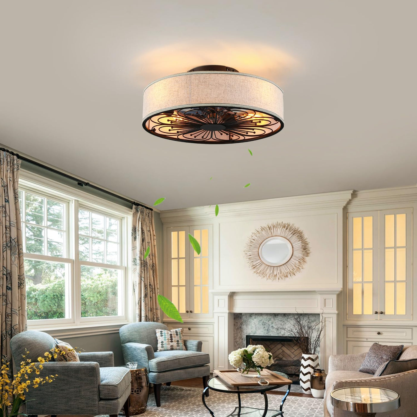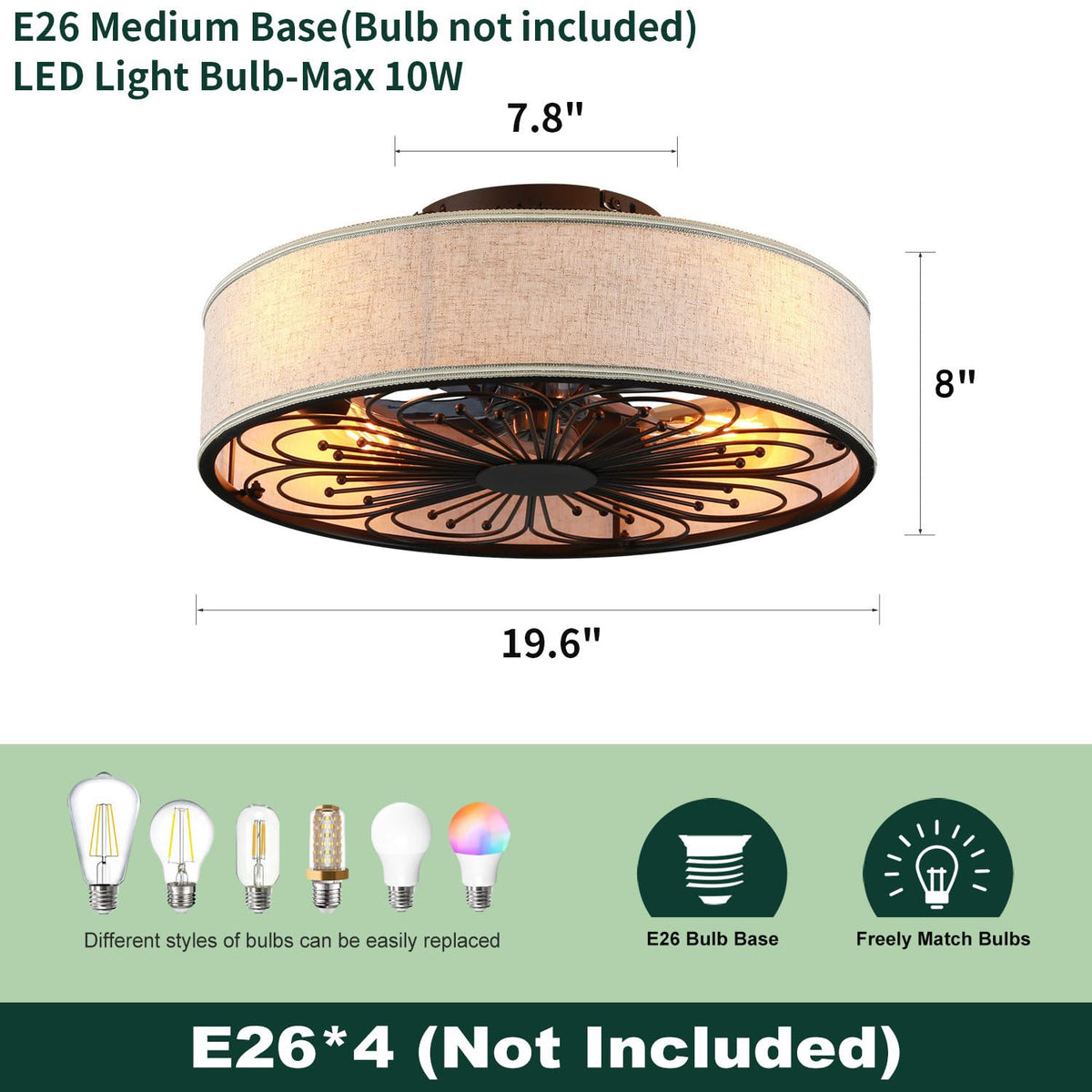 Transform Your Space With This Stunning 19.6-Inch Boho Rattan Caged Ceiling Fan That Seamlessly Blends Form And Function. The Elegant Design Features A Fabric Drum Shade With A Black Flower Caged Motif Underneath, Creating A Unique Bohemian Farmhouse Aesthetic.Measuring 19.6 Inches In Diameter And 8 Inches In Height, This Low-Profile Flush Mount Fixture Is Perfect For Rooms With Standard Ceiling Heights. The Fan Includes A Convenient Remote Control With 6 Adjustable Speeds And Reversible Motor Operation For Year-Round Comfort. Compatible With Various E26 Bulbs (Max 40W Each, Requires 4 Bulbs, Not Included), The Fixture Allows You To Customize Your Lighting Experience. The Matte Black Finish And Sleek Grey Blades Add Sophisticated Detail, While The Neutral Fabric Shade Diffuses Light Beautifully. This Versatile Fandalier Brings Together The Functionality Of A Cage Ceiling Fan The Elegance Of A Chandelier, Making It An Ideal Choice For Bedrooms, Living Rooms, Or Any Space Needing Both Air Circulation And Ambient Lighting.