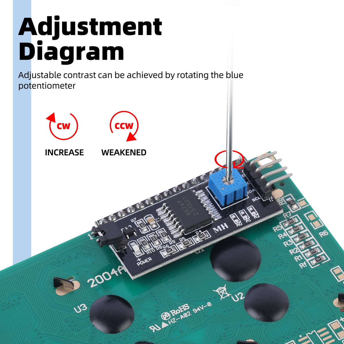 Q: How do I adjust the backlight and contrast of the display?A: The module features a built-in independent potentiometer that allows you to adjust the backlight and contrast easily for optimal readability.