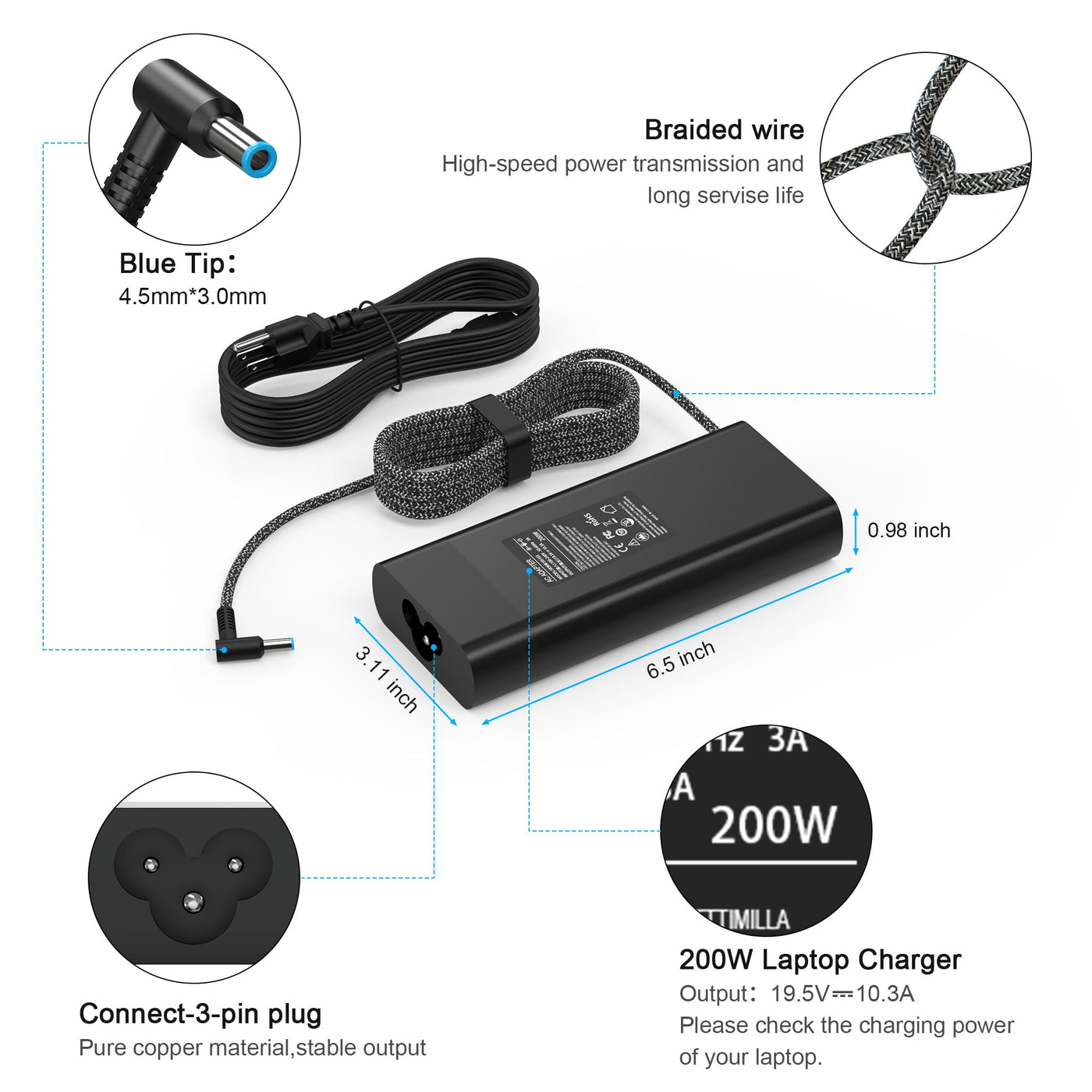 ?Power Parameters?Output: 200W 19.5V 10.3A Input: 100-240V 50-60Hz Connector Size: 4.5*3.0Mm Blue Tip (Compatible With 150W 135W 120W)