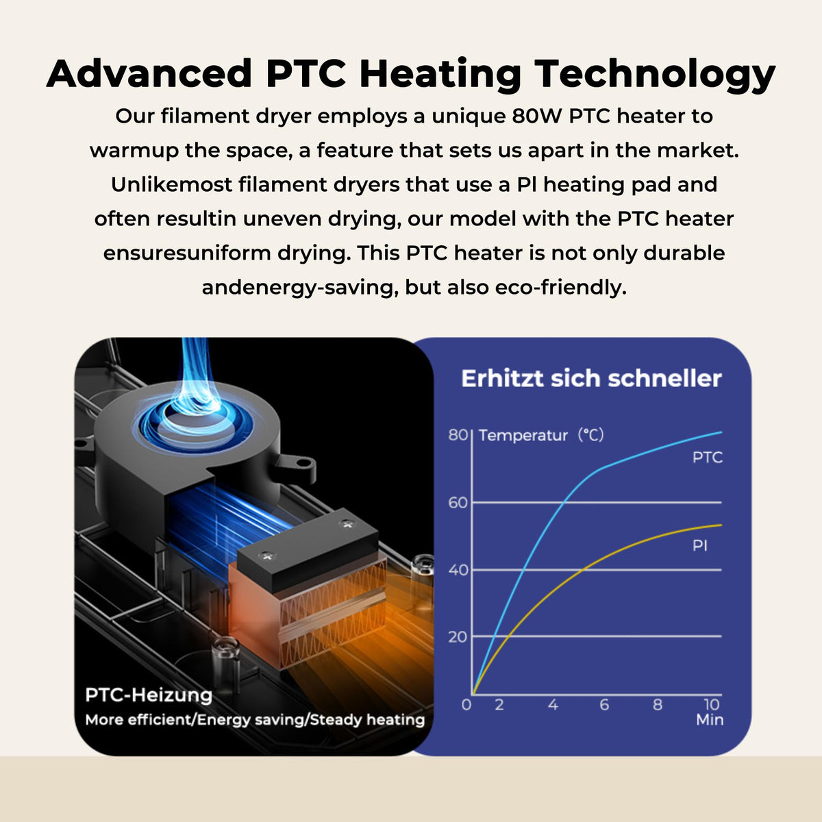 Q: How does the PTC heater in the Space Pi Plus enhance drying efficiency?A: The PTC heater in the Space Pi Plus utilizes 360° hot air circulation, heating up faster and more efficiently than standard heaters. This design promotes uniform heating, effectively drying moisture from filaments and improving overall 3D printing results.