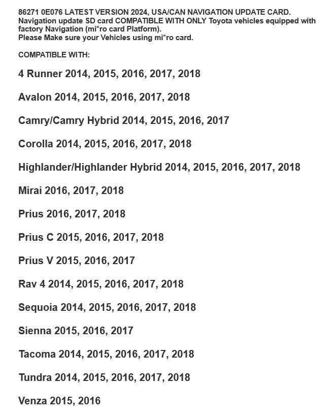 86271 0E076 Latest Version 2024, Usa/Can Navi..On Upd..E Card. Navig.On Upd.T Card Compatible With Only Toyota Vehicles Equipped With Factory Navi..On.(Mi*Ro Card Platform).Please Make Sure Your Vehicles Using Mi*Ro Card.Drive Confidently Through Unfamiliar Or Recently Changed Areas And Arrive At Your Destination Quickly And Efficientlynav.On Upd.T Card Seamlessly Will Work And Compatible With Only Toyota, Simple Plug N Play Installationcompatible With:4 Runner 2014,2015,2016,2017,2018Avalon 2014, 2015,2016,2017,2018Camry/Camry Hybrid 2014,2015,2016,2017Corolla 2014,2015,2016,2017,2018Highlander/Highlander Hybrid 2014,2015,2016,2017,2018Mirai 2016,2017,2018Prius 2016,2017,2018Prius C 2015,2016,2017,2018Prius V 2015,2016,2017Rav 4 2014,2015,2016,2017,2018 Sequoia 2014,2015,2016,2017,2018Sienna 2015,2016,2017Tacoma 2014,2015,2016,2017,2018Tundra 2014,2015,2016,2017,2018 Venza 2015,2016