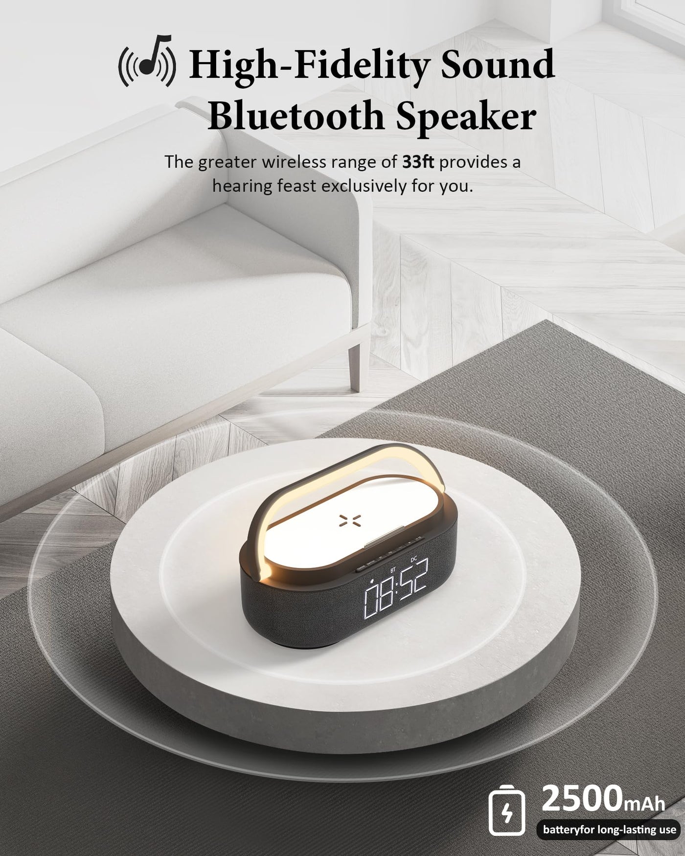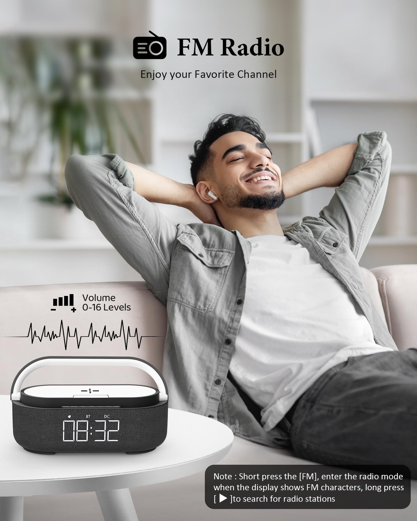 6 In 1 Bluetooth Speaker With&Nbsp;Wireless Charging- You Can Get Bluetooth Speaker+Fm Radio+&Nbsp;Digital Alarm Clock+15W Wireless Charger+ 4-Level Adjustable Night Light + Phone Holder. One Item Realizes All Your Desk And Bedside Needs And Makes Your Messy Desktop Instantly Clean. 2022 Fashionable Appearance For Home Decor-Colsur Digital Alarm Clock Made Of Quality Materials With A Smooth Touch Top And Fabric Wrap Round Speaker, Making It Great For Bedroom, Living Room, Or Kitchen Counter. Its Exquisite Design Is Definitely A Wonderful Gift For Someone You Love.&Nbsp; &Nbsp; &Nbsp; &Nbsp; &Nbsp; Adjustable Led Display Digital Alarm Clock-The Led Digital Display Clock Offers 4-Levels Of Brightness (Dim, Low, Medium, And High), Making Reading The Time Easy. The Alarm Clock For Bedrooms Can Adjust Volume And Has Active And Passive Dual Snooze Mode, Letting You Rest Assured To Sleep. &Nbsp; 15W Wireless Charging &Amp; 2500 Mah Battery Backup-Intelligent Qi Charging Protocol Provides Fast And Safe 15W Charging For Ios And Android Devices. When Using The Wireless Charging Function, Please Plug In The Power Supply.&Nbsp;2500Mah Rechargeable &Nbsp;Large &Nbsp;Battery Can Work For 100 Hours For The Lamp Or 180 Hours For The Alarm Clock. Powerful Dual Speakers &Amp; Bluetooth 5.0- Colsur Wireless Speaker With A Thumping Volume Provides Immersive Sound With Rich Bass. Come To A Hearing Feast Exclusively For You. Upgraded&Nbsp;Bluetooth 5.0 Speaker Provides A Greater Wireless Range Of 33Ft Which Can Connect Normally Under Difficult Conditions. Note:&Nbsp; Our New Product Guides And Document Had Updated, Please Download Them From The Clock Product Page.If You Find This Alarm Clock Bluetooth Speaker Can Not Be Used Normally, Please Charge The Product For 5 Minutes And Try To Use It Again).