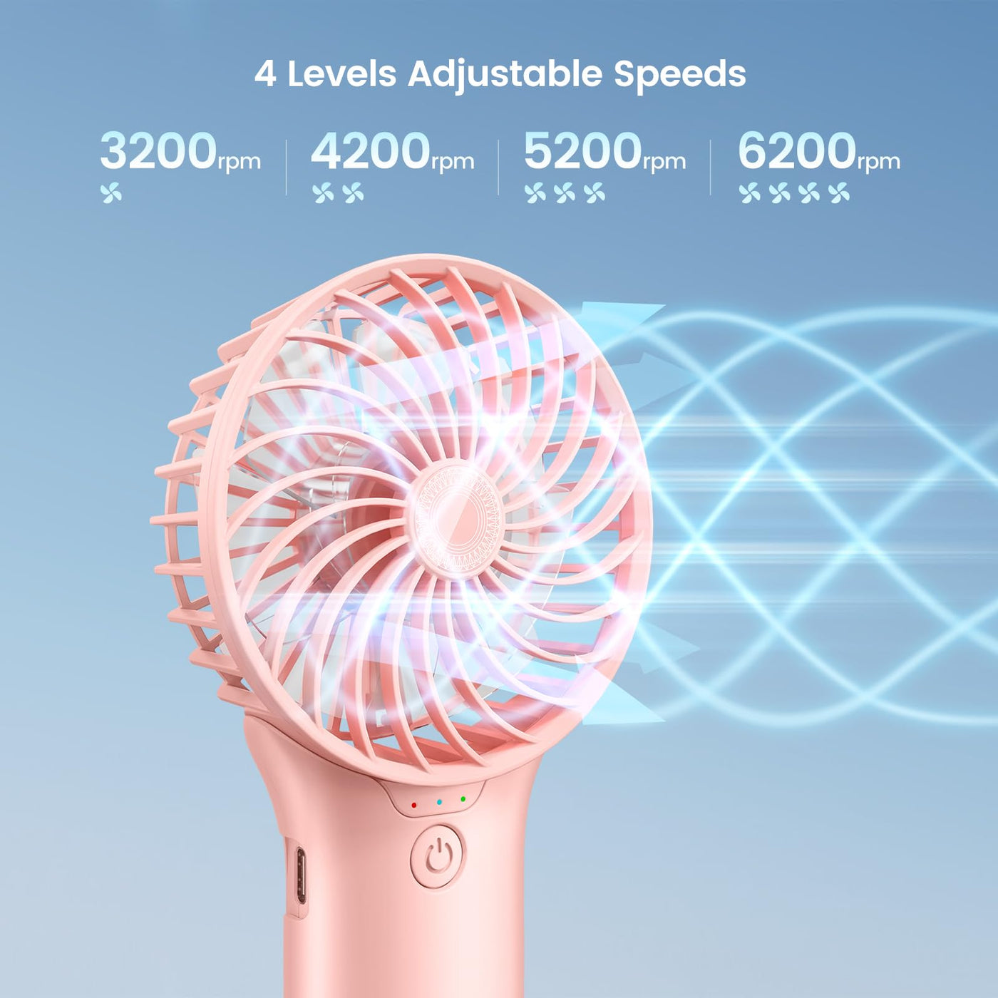 Q: What are the different speed settings on the handheld fan?A: The handheld fan features 4 adjustable speed settings, allowing you to choose between a gentle natural breeze or a strong cool wind, making it perfect for various conditions.