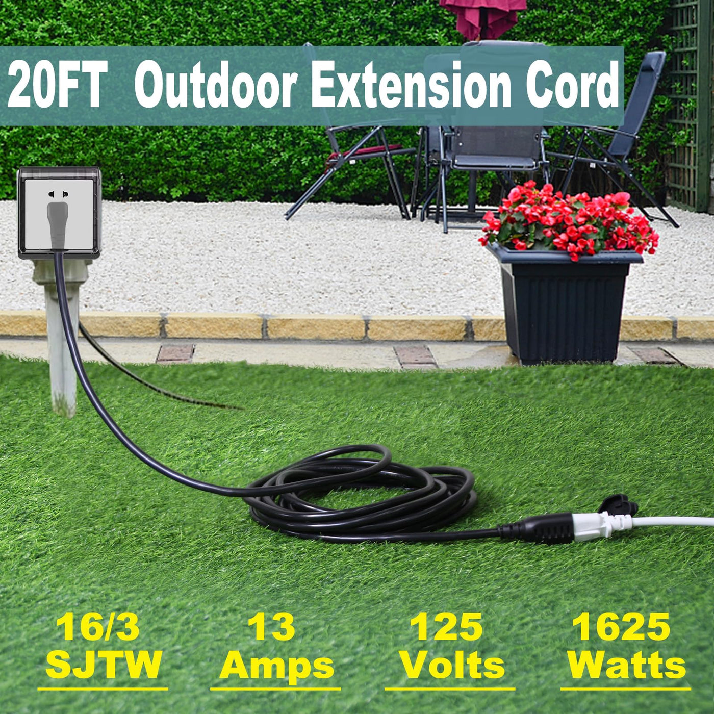 Q: What is the maximum wattage this 20FT black outdoor extension cord can handle?A: The 20FT black outdoor extension cord can handle a maximum wattage of 1625 watts, making it suitable for various outdoor appliances and equipment.