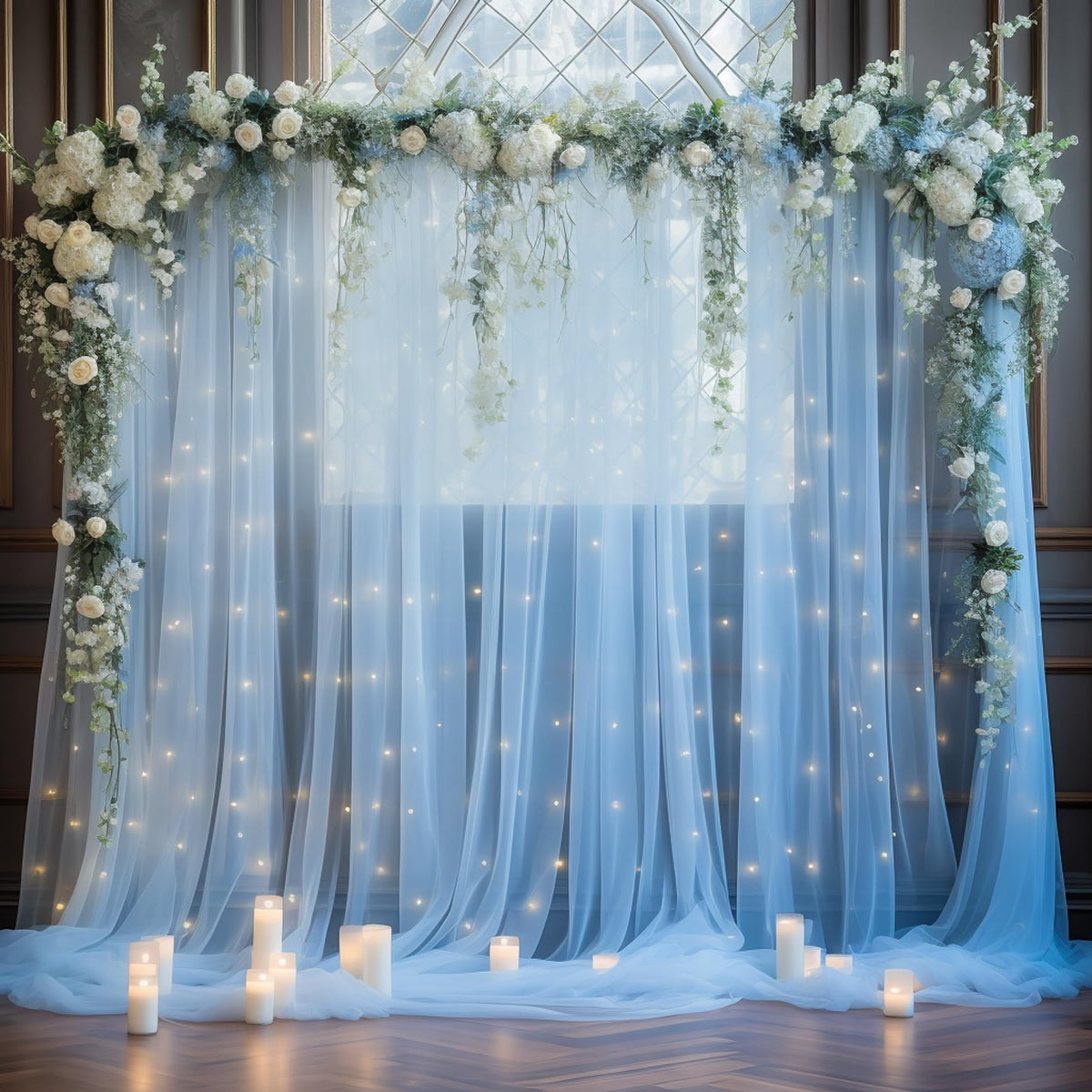 20X10Ft Baby Blue Tulle Backdrop Curtain With Lights String For Parites, Sheer Backdrop Curtains For Wedding Baby Shower Birthda
