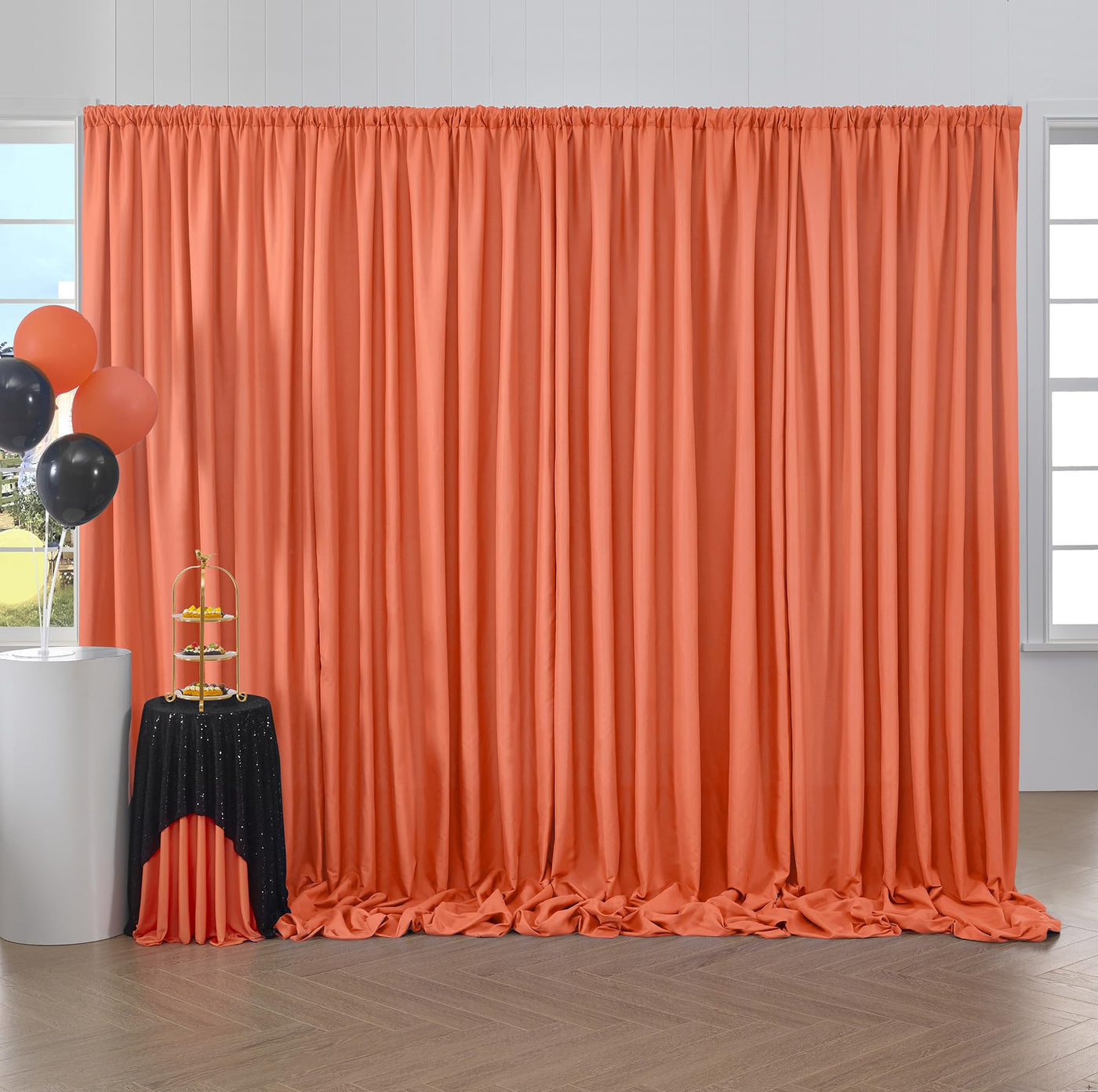 Q: What decoration tips can enhance my event with these curtains?A: Pairing the black backdrop curtains with flowers, lights, and balloons can add a colorful and festive touch to your event, making it more visually appealing.
