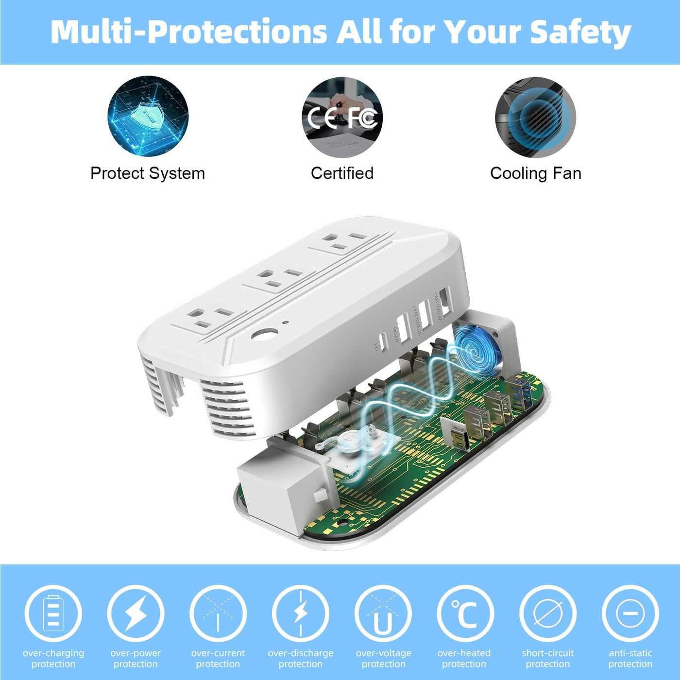 Q: What safety features does the converter include?A: The converter is equipped with multiple safety features, including over temperature protection, overcurrent protection, overvoltage protection, short circuit protection, and surge protection. It also has dual cooling fans to prevent overheating during operation.