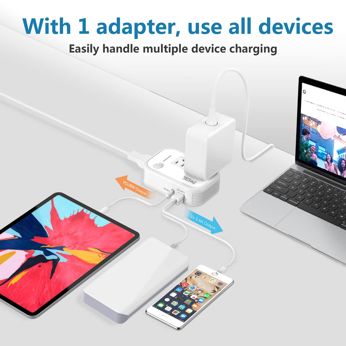 Q: How many devices can I charge simultaneously with this adapter?A: The travel power strip features 2 AC outlets and 3 USB charging ports, including an 18W PD Type-C port, allowing you to charge multiple devices simultaneously. This makes it a convenient solution for powering various electronics while traveling.